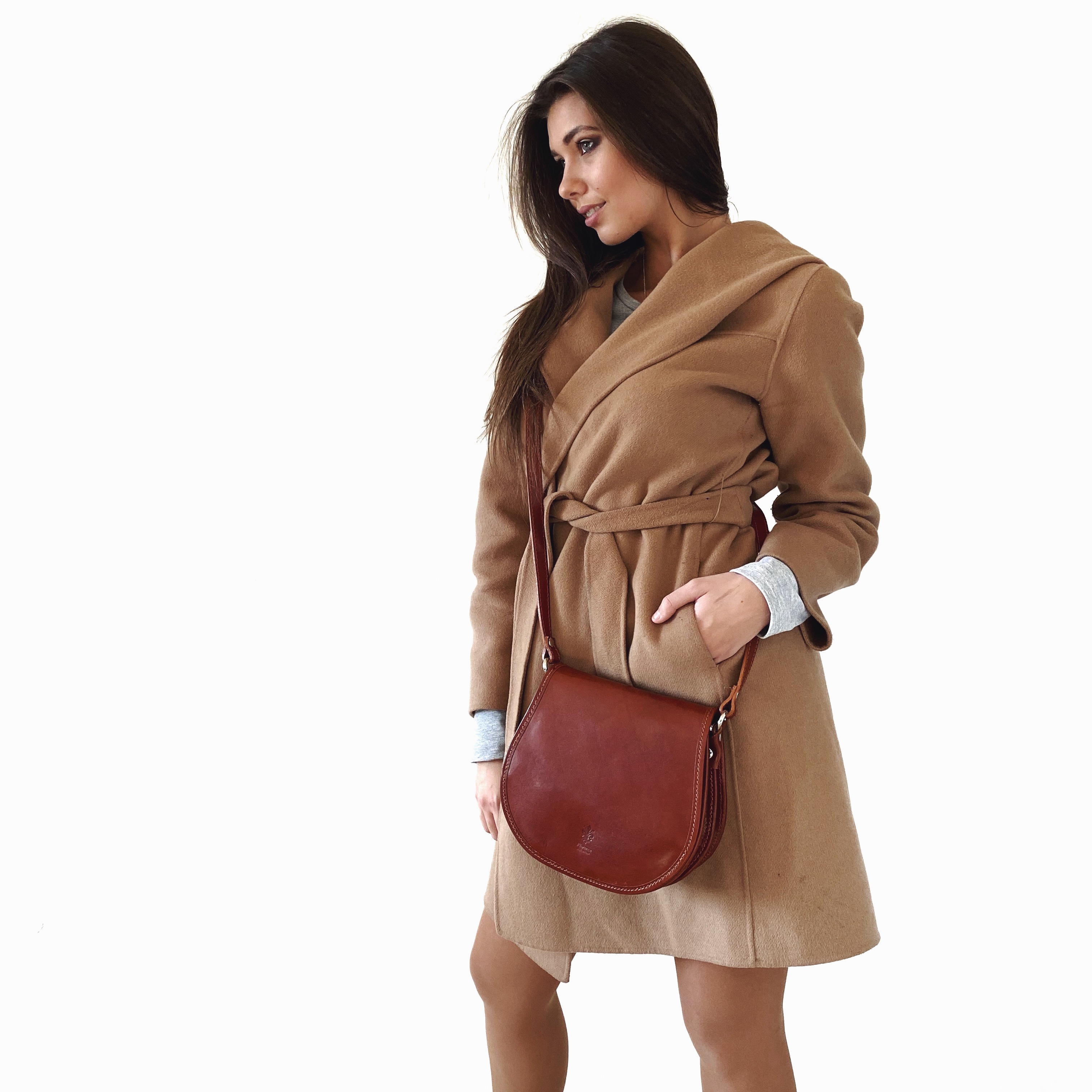 Malá šikovná kabelka se zajímavým tvarem. Kabelka je vyrobená z pravé kůže, která velice dobře drží svůj tvar. Je vhodná na nošení přes rameno nebo cross-body (křížem).
