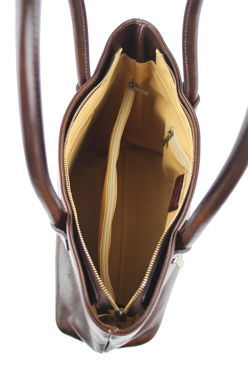Dostatečně dlouhé a pevné kožené rukojeti zajišťují pohodlné nošení na rameni, ať už míříte do práce, na obchodní schůzku nebo na nákupy. Prostorný interiér kabelky snadno pojme všechny vaše nezbytnosti – dokumenty formátu A4, tablet, peněženku, kosmetiku a další.