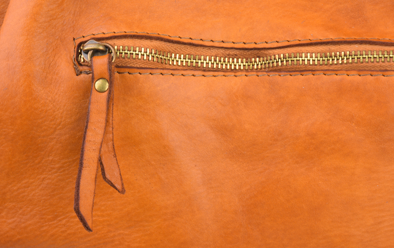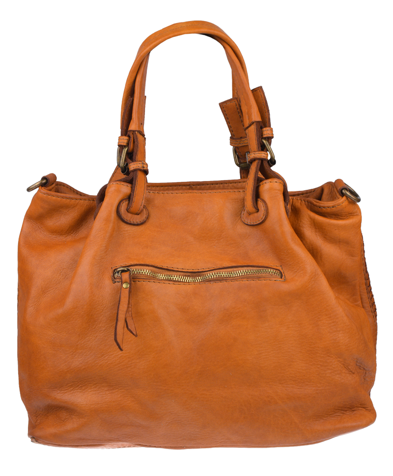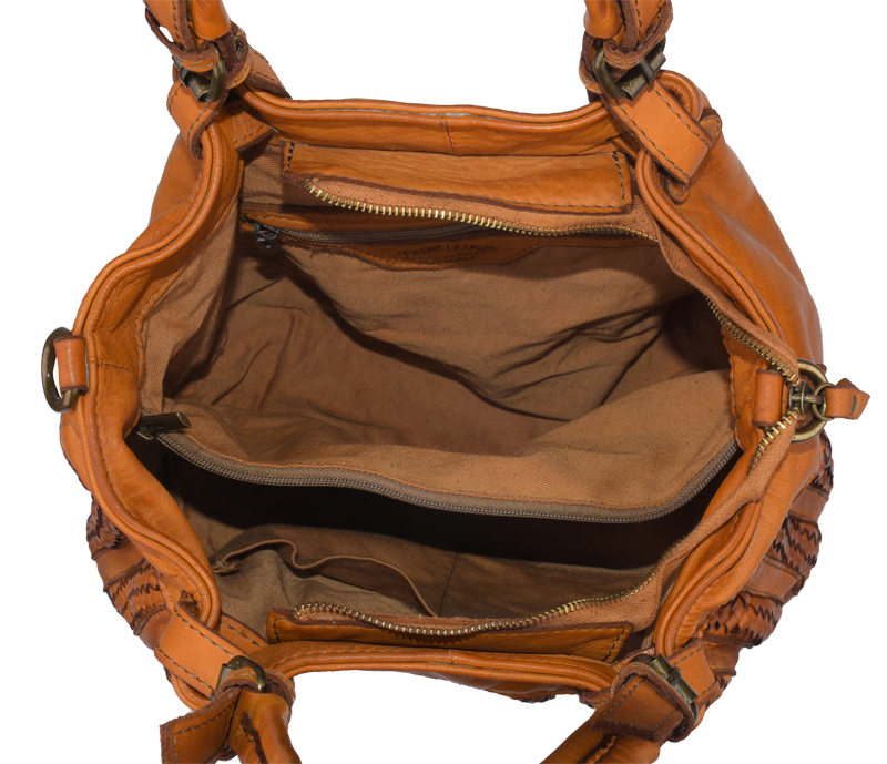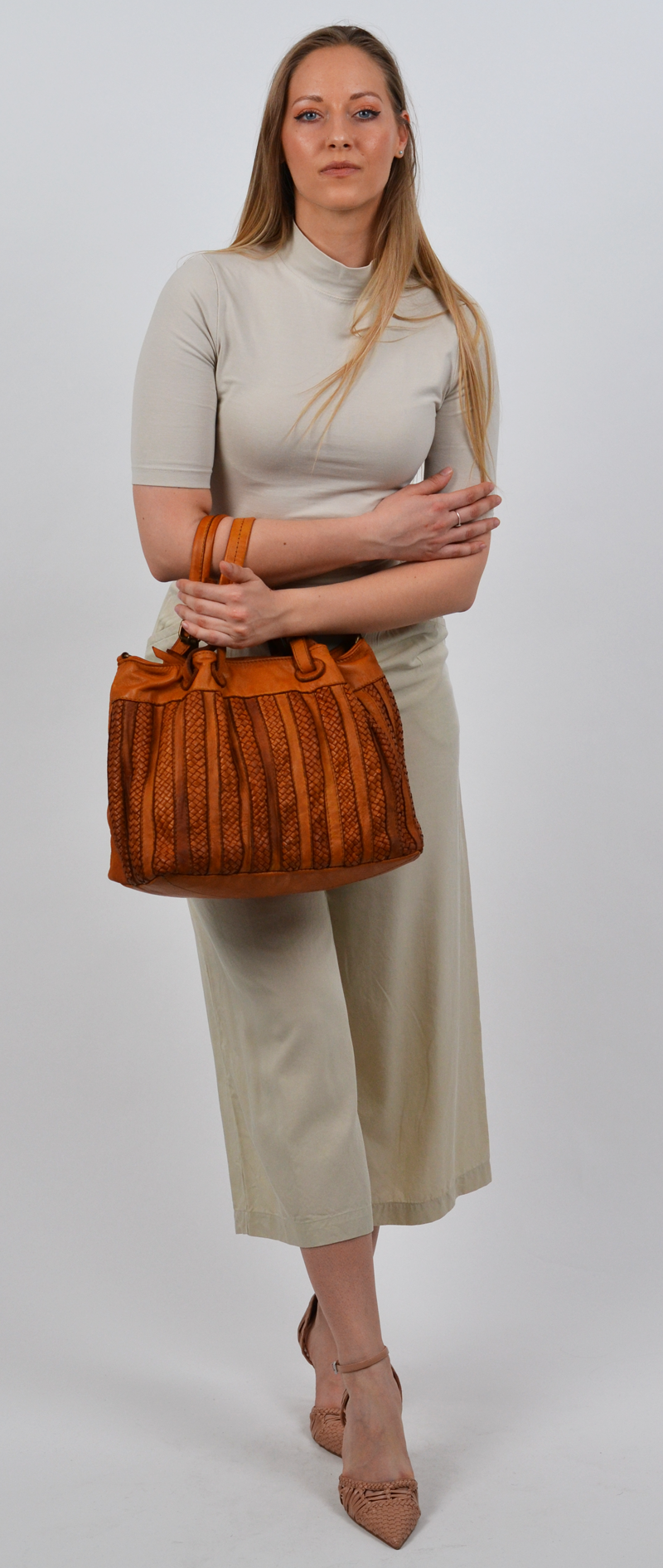 Praktická a prostorná kožená kabelka v camel barvě. Důmyslné proplétané provedení dělá tuto kabelku neobyčejně praktickou pro denní nošení. Vnitřek kabelky je vybaven kapsou na zip.