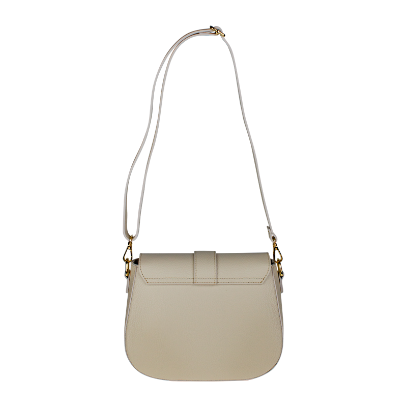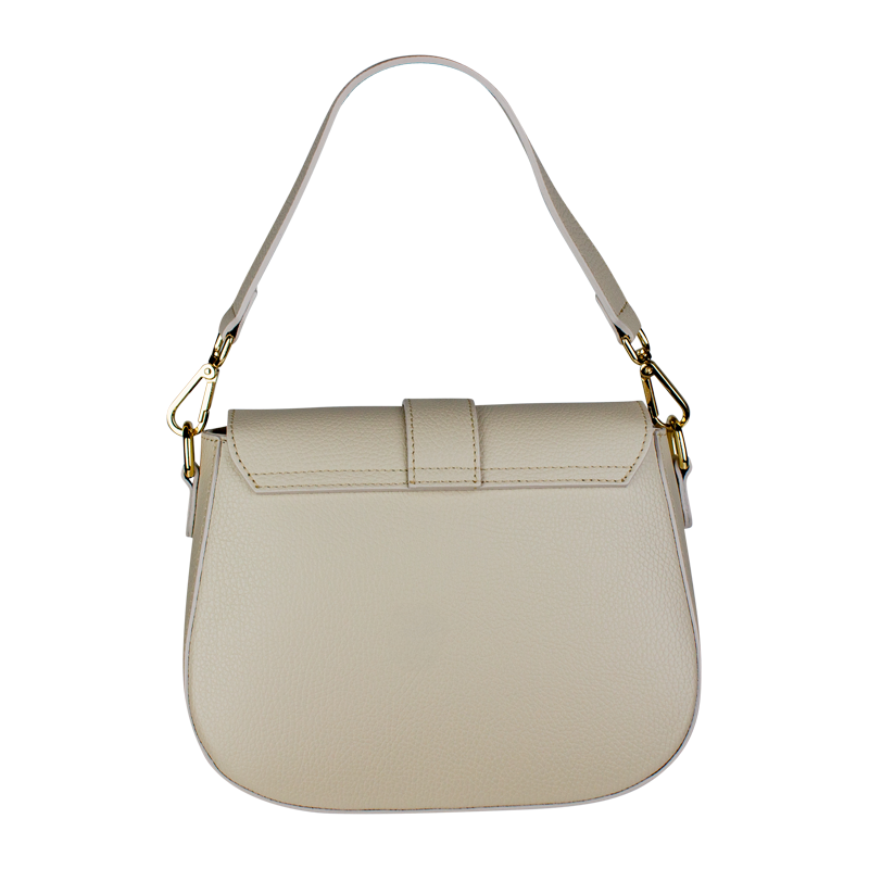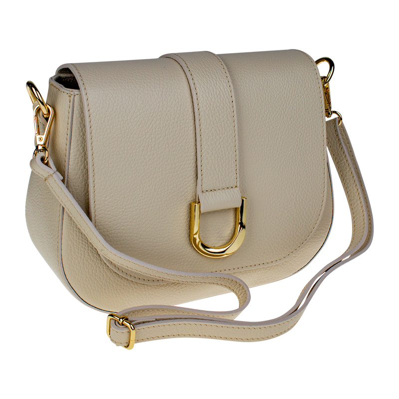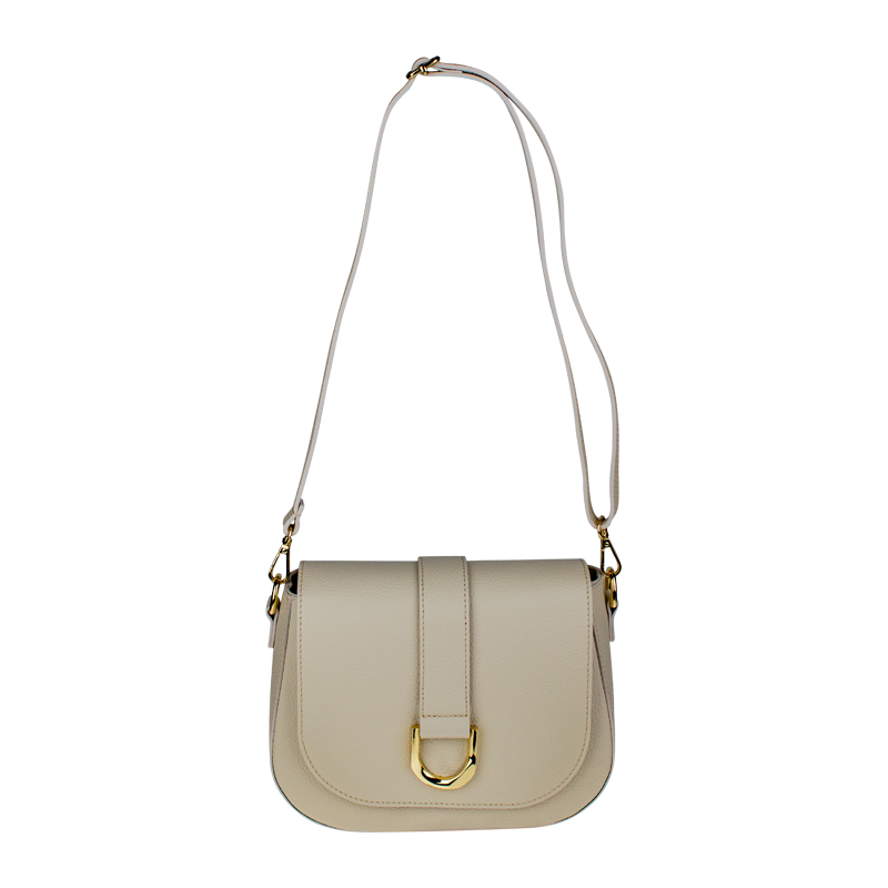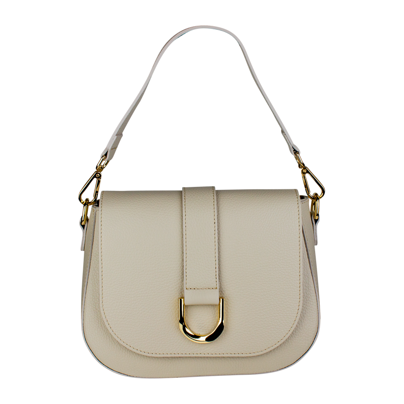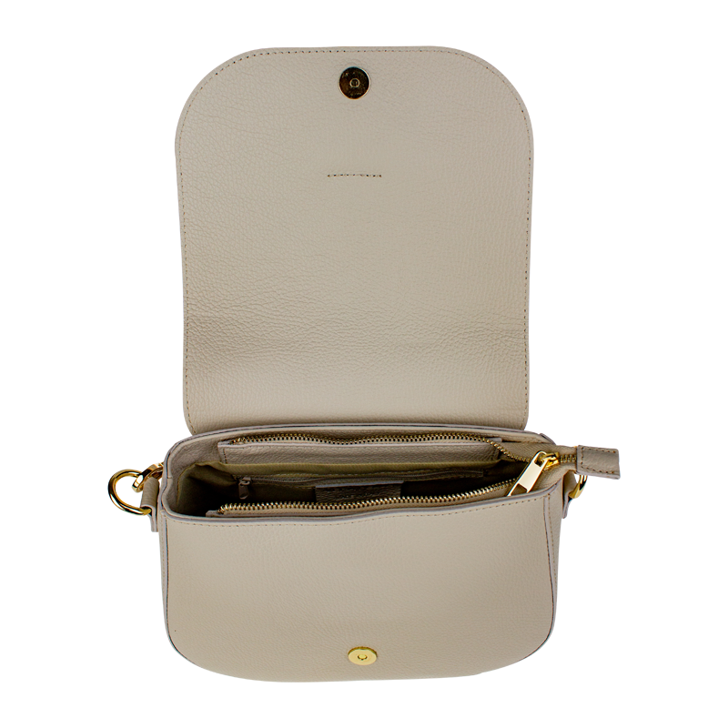 Béžová kabelka nositelná přes rameno či cross-body (křížem). Tato kožená kabelka je uzavíratelná na patentku a uvnitř nalezneme přihrádku na zip. Kabelka má nastavitelný popruh s maximální délkou cca 118 cm.