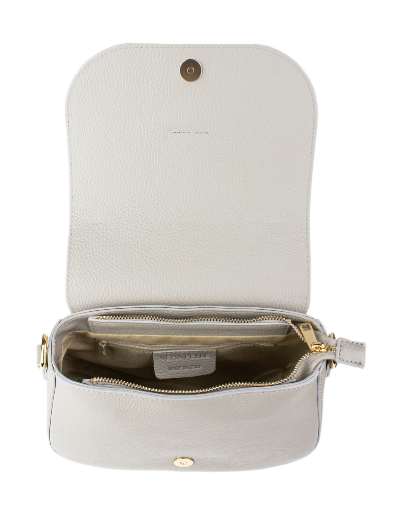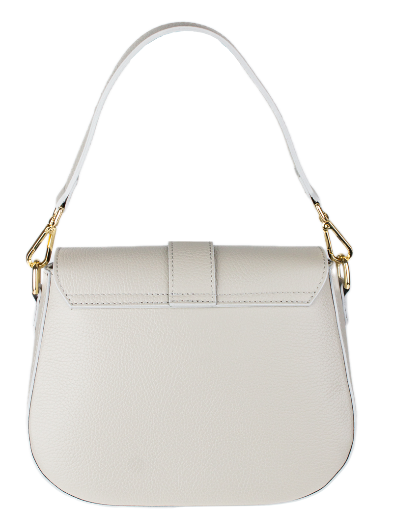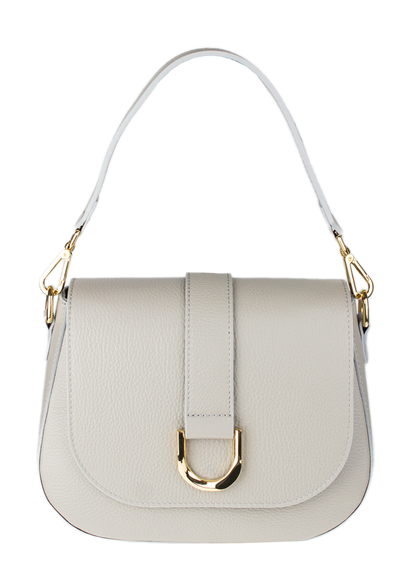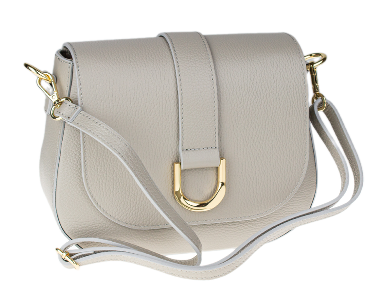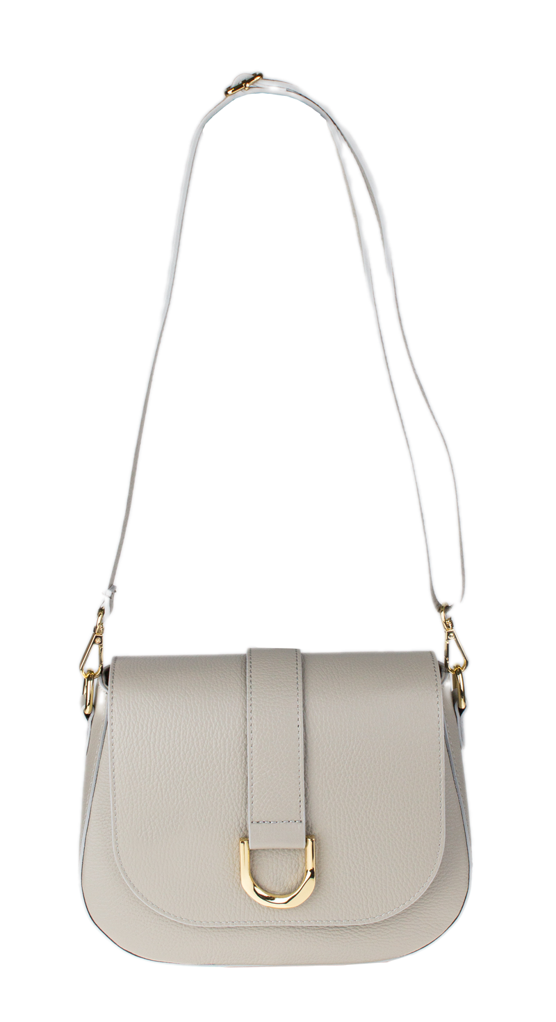 Šedá kabelka nositelná přes rameno či cross-body (křížem). Tato kožená kabelka je uzavíratelná na patentku a uvnitř nalezneme přihrádku na zip. Kabelka má nastavitelný popruh s maximální délkou cca 118 cm.