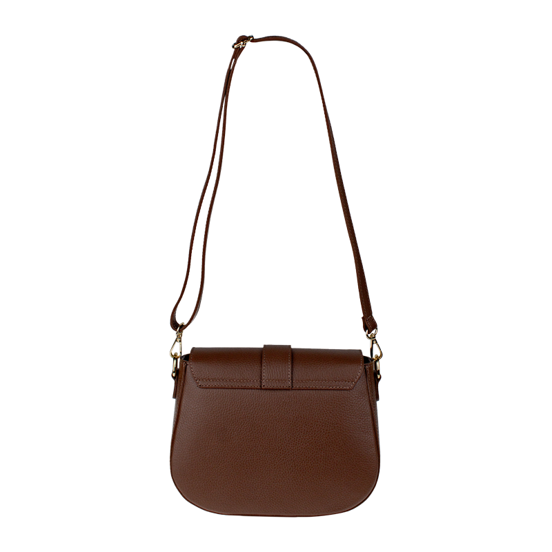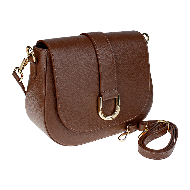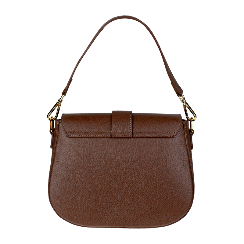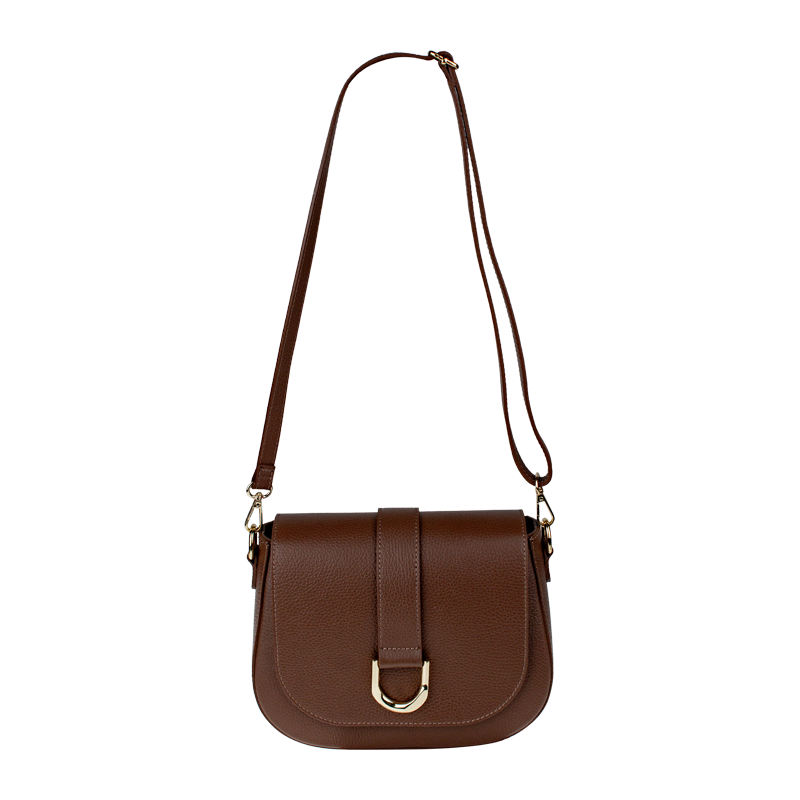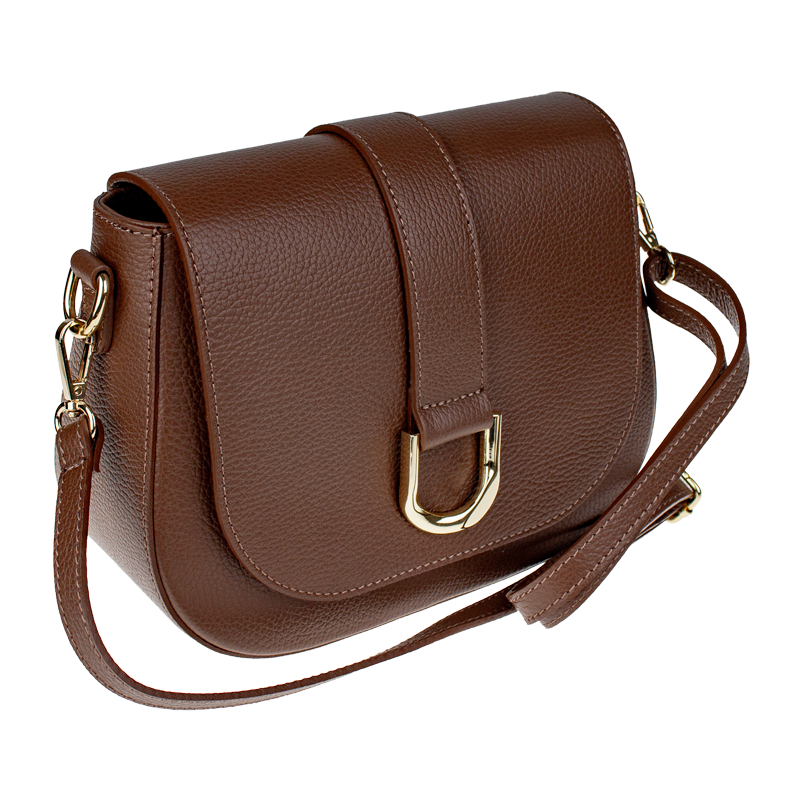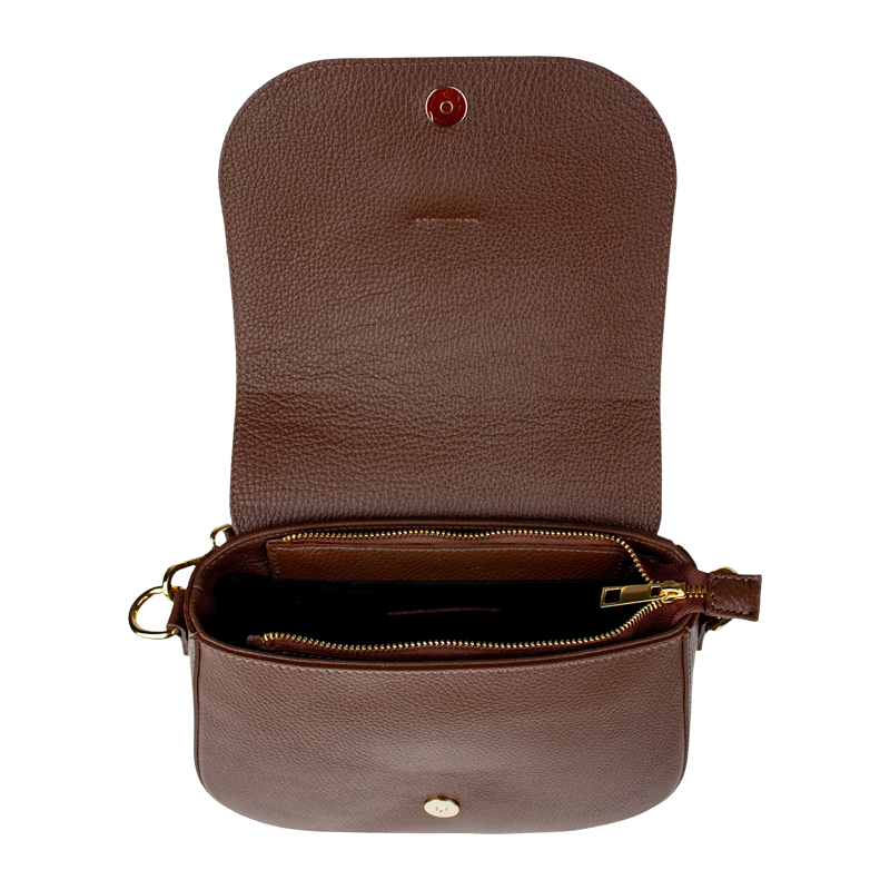Hnědá kabelka nositelná přes rameno či cross-body (křížem). Tato kožená kabelka je uzavíratelná na patentku a uvnitř nalezneme přihrádku na zip. Kabelka má nastavitelný popruh s maximální délkou cca 118 cm.