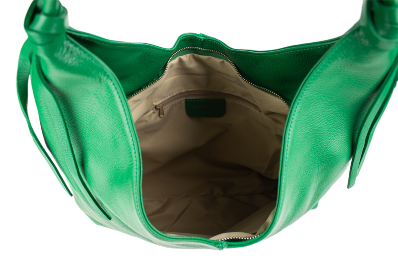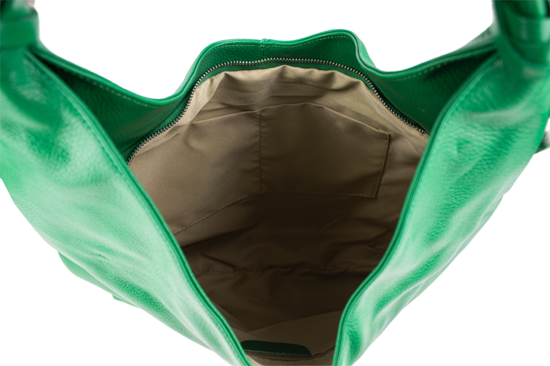Tato stylová kabelka typu „shopping bag“ vás na první pohled zaujme svou krásnou zelenou barvou a moderním, uvolněným střihem (tzv. hobo style). Je vyrobena z materiálu s jemnou zrnitou texturou, která jí dodává luxusní vzhled a je příjemná na dotek.