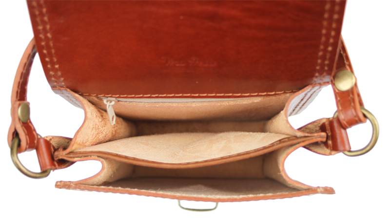 Malá šikovná kabelka se zajímavým tvarem. Kabelka je vyrobená z pravé kůže, která velice dobře drží svůj tvar. Je vhodná na nošení přes rameno nebo cross-body (křížem).