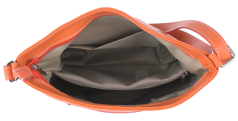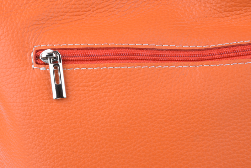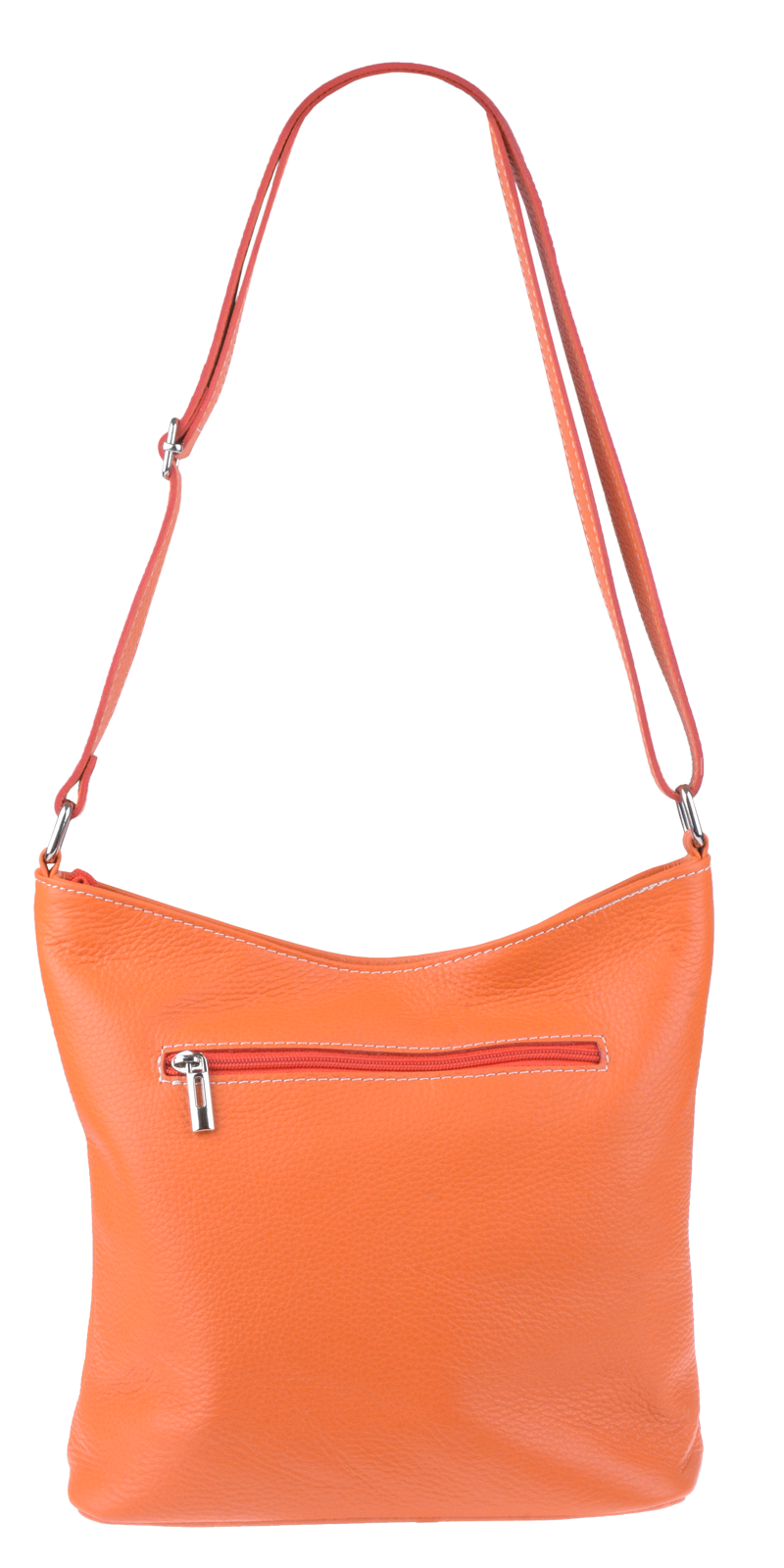 Klasická praktická kabelka s jednoduchým designem v oranžové barvě. Nositelná přes rameno nebo crossbody. Kabelka je uzavíratelná na zip a je vyrobena z pravé poctivé kůže. Uvnitř kabelky najdeme přepážku uprostřed, která zároveň slouží jako kapsa na zip, a na bočních stěnách pak kapsu na zip a na druhé straně další malou kapsu. Délka popruhu je 120 cm.