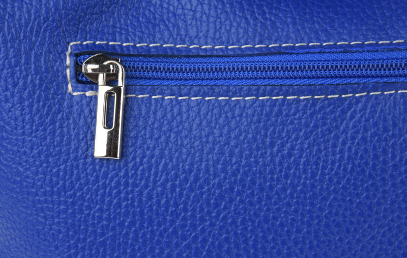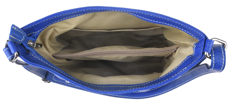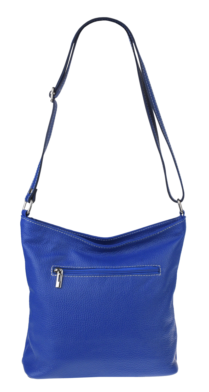 Klasická praktická kabelka s jednoduchým designem v modré barvě. Nositelná přes rameno nebo crossbody. Kabelka je uzavíratelná na zip a je vyrobena z pravé poctivé kůže. Uvnitř kabelky najdeme přepážku uprostřed, která zároveň slouží jako kapsa na zip, a na bočních stěnách pak kapsu na zip a na druhé straně další malou kapsu. Délka popruhu je 120 cm.