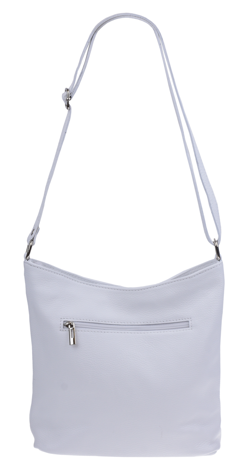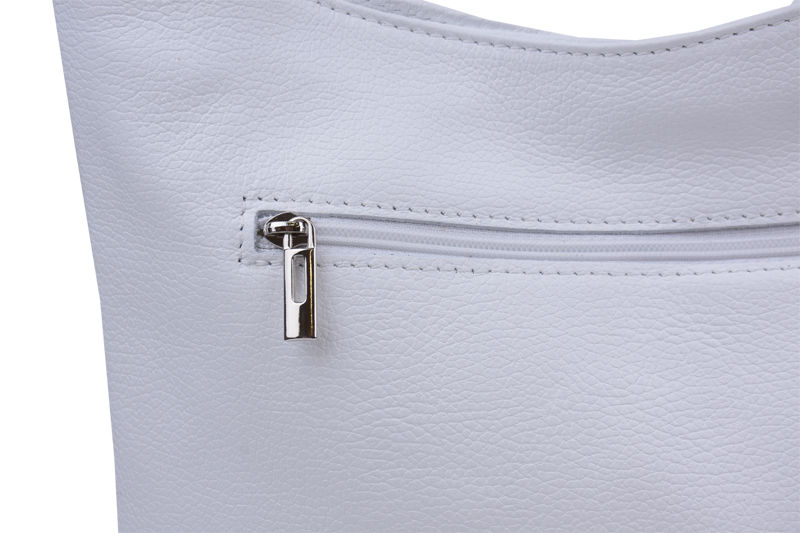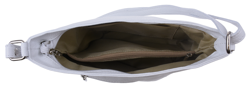 Klasická praktická kabelka s jednoduchým designem v bílá barvě. Nositelná přes rameno nebo crossbody. Kabelka je uzavíratelná na zip a je vyrobena z pravé poctivé kůže. Uvnitř kabelky najdeme přepážku uprostřed, která zároveň slouží jako kapsa na zip, a na bočních stěnách pak kapsu na zip a na druhé straně další malou kapsu. Délka popruhu je 120 cm.
