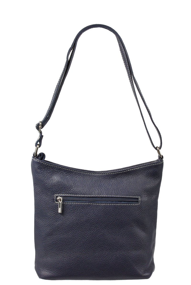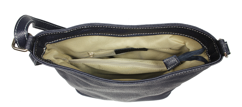 Klasická praktická kabelka s jednoduchým designem v modré barvě. Nositelná přes rameno nebo crossbody. Kabelka je uzavíratelná na zip a je vyrobena z pravé poctivé kůže. Uvnitř kabelky najdeme přepážku uprostřed, která zároveň slouží jako kapsa na zip, a na bočních stěnách pak kapsu na zip a na druhé straně další malou kapsu. Délka popruhu je 120 cm.