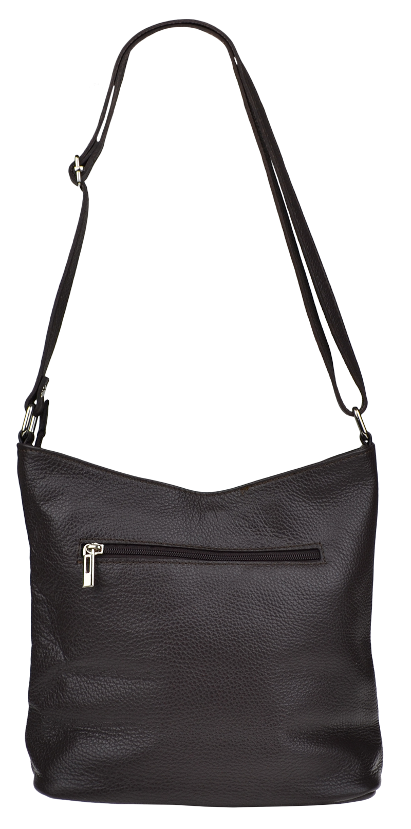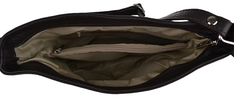 Klasická praktická kabelka s jednoduchým designem v cafe barvě. Nositelná přes rameno nebo crossbody. Kabelka je uzavíratelná na zip a je vyrobena z pravé poctivé kůže. Uvnitř kabelky najdeme přepážku uprostřed, která zároveň slouží jako kapsa na zip, a na bočních stěnách pak kapsu na zip a na druhé straně další malou kapsu. Délka popruhu je 120 cm.