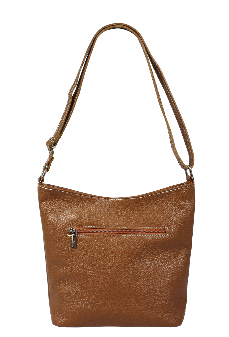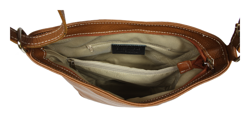 Klasická praktická kabelka s jednoduchým designem v hnědé barvě. Nositelná přes rameno nebo crossbody. Kabelka je uzavíratelná na zip a je vyrobena z pravé poctivé kůže. Uvnitř kabelky najdeme přepážku uprostřed, která zároveň slouží jako kapsa na zip, a na bočních stěnách pak kapsu na zip a na druhé straně další malou kapsu. Délka popruhu je 120 cm.