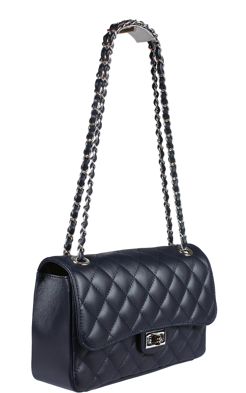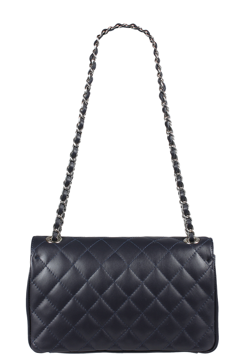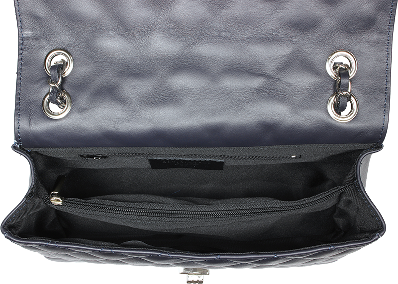 Krásná tmavě-modrá kabelka z měkké kůže. Tato originální kabelka určená k nošení přes rameno je vhodným doplňkem pro pravidelné nošení. Kabelka je uzavíratelná důmyslnou patentkou, která zároveň slouží jako ozdobný prvek. Uvnitř kabelky nalezneme kapsu na zip. Délka řetízku přes rameno je 120 cm.