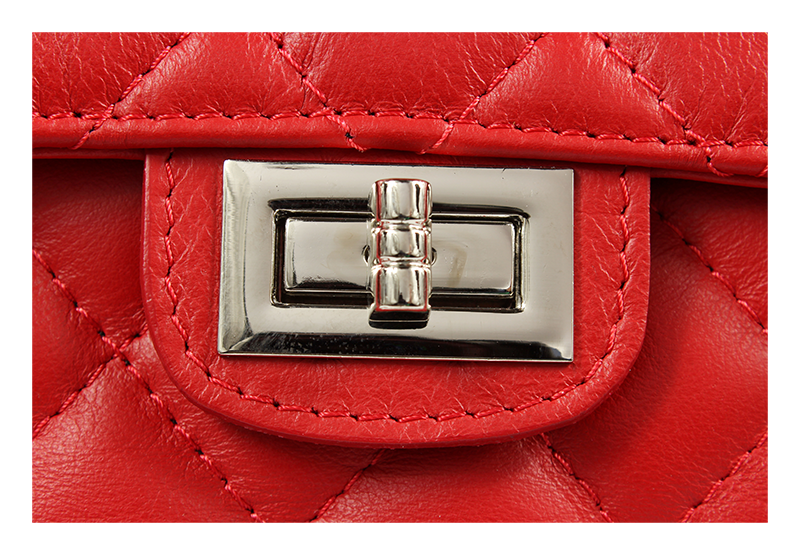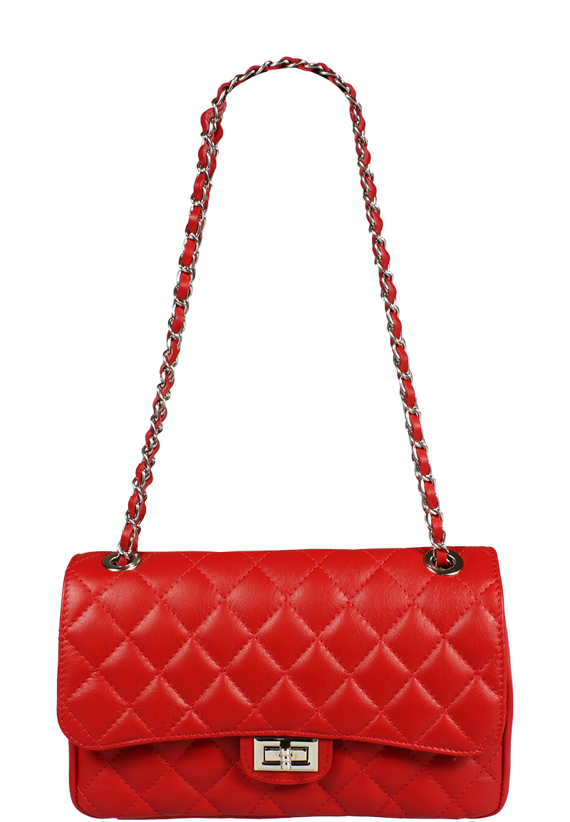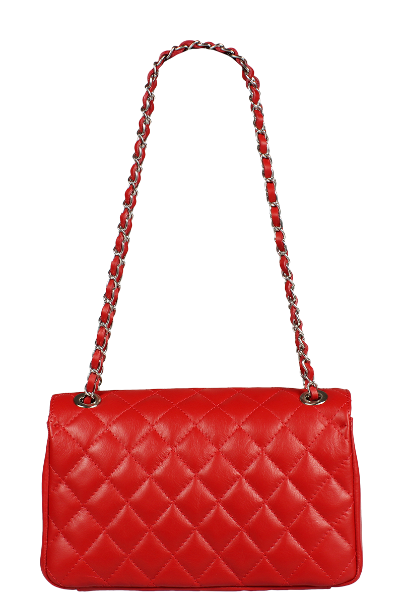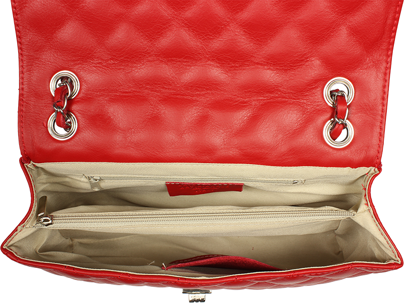 Krásná červená kabelka z měkké kůže. Tato originální kabelka určená k nošení přes rameno je vhodným doplňkem pro pravidelné nošení. Kabelka je uzavíratelná důmyslnou patentkou, která zároveň slouží jako ozdobný prvek. Uvnitř kabelky nalezneme kapsu na zip. Délka řetízku přes rameno je 120 cm.