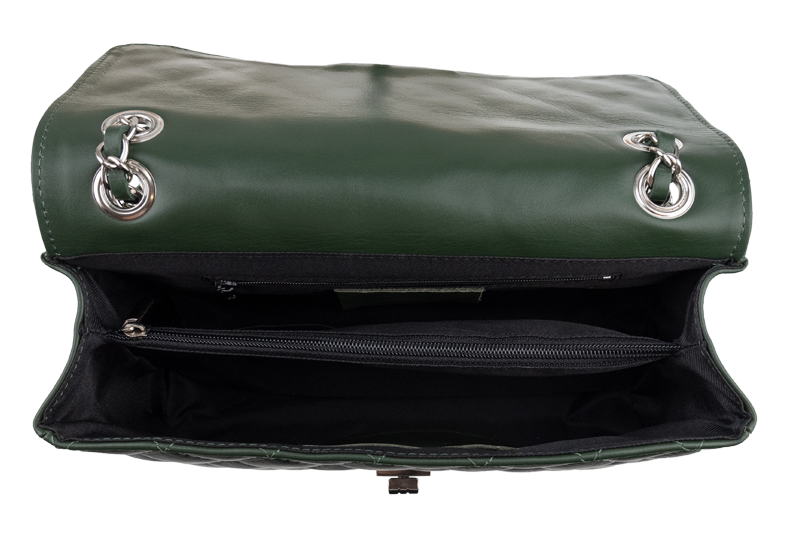 Krásná zelená kabelka z měkké kůže. Tato originální kabelka určená k nošení přes rameno je vhodným doplňkem pro pravidelné nošení. Kabelka je uzavíratelná důmyslnou patentkou, která zároveň slouží jako ozdobný prvek. Uvnitř kabelky nalezneme kapsu na zip. Délka řetízku přes rameno je 120 cm.