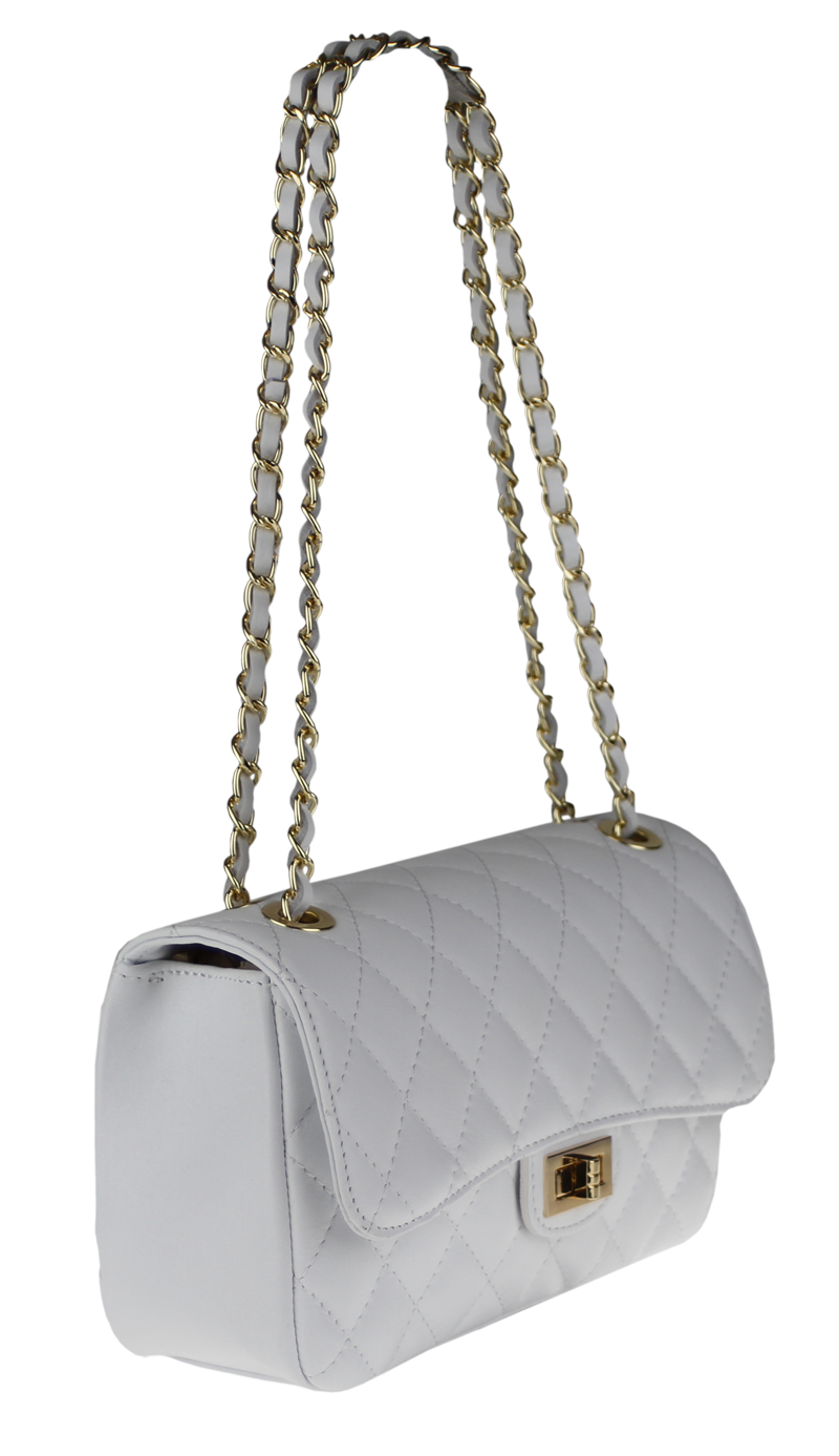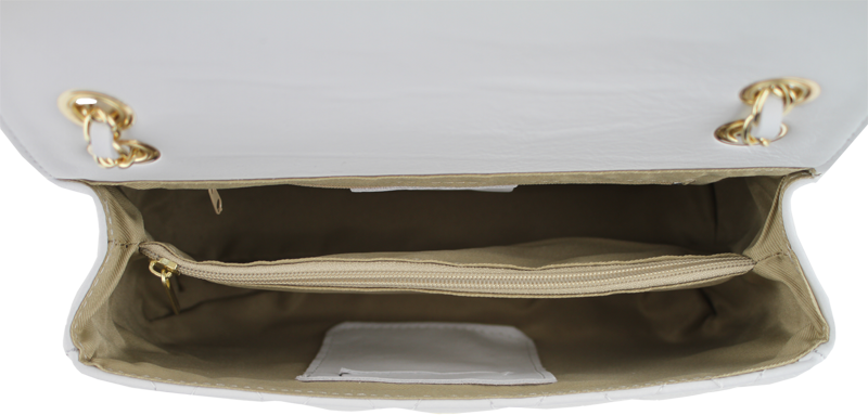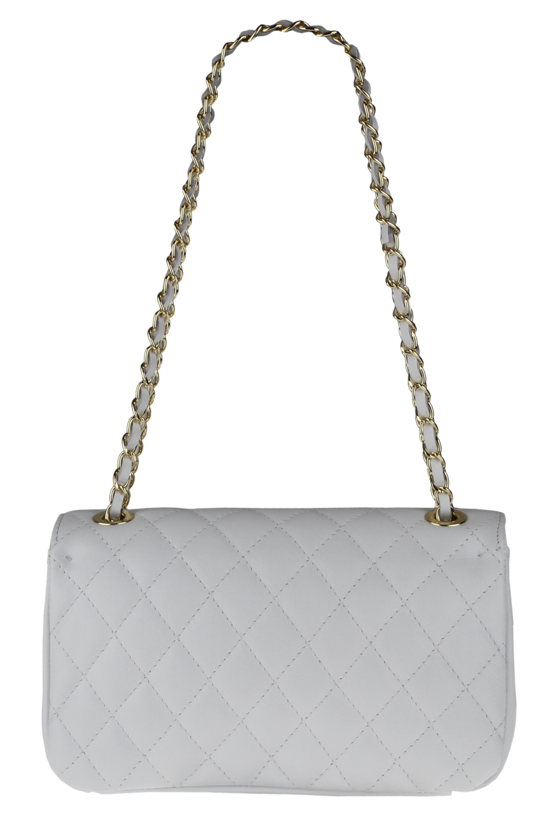 Krásná bílá kabelka z měkké kůže. Tato originální kabelka určená k nošení přes rameno je vhodným doplňkem pro pravidelné nošení. Kabelka je uzavíratelná důmyslnou patentkou, která zároveň slouží jako ozdobný prvek. Uvnitř kabelky nalezneme kapsu na zip. Délka řetízku přes rameno je 120 cm.