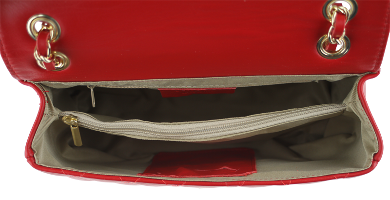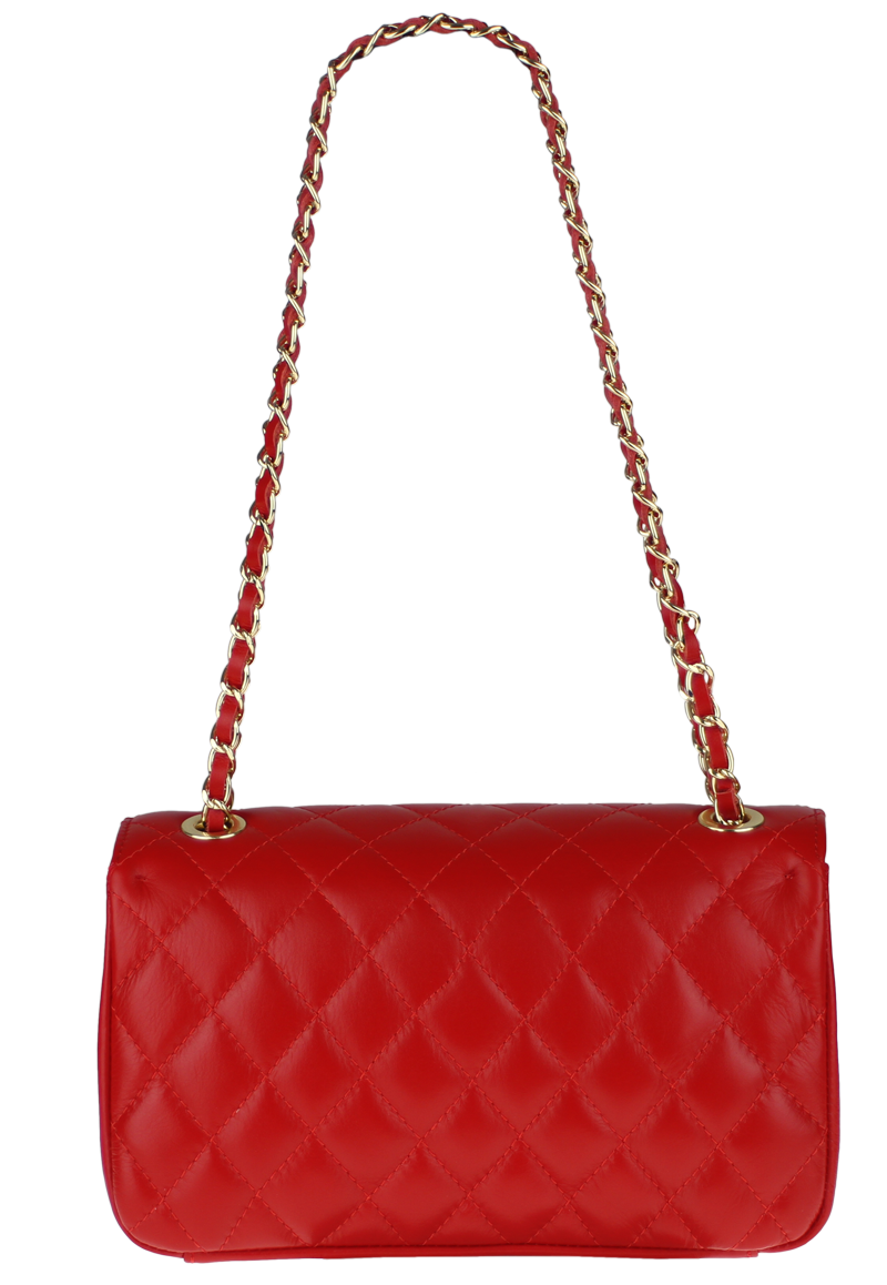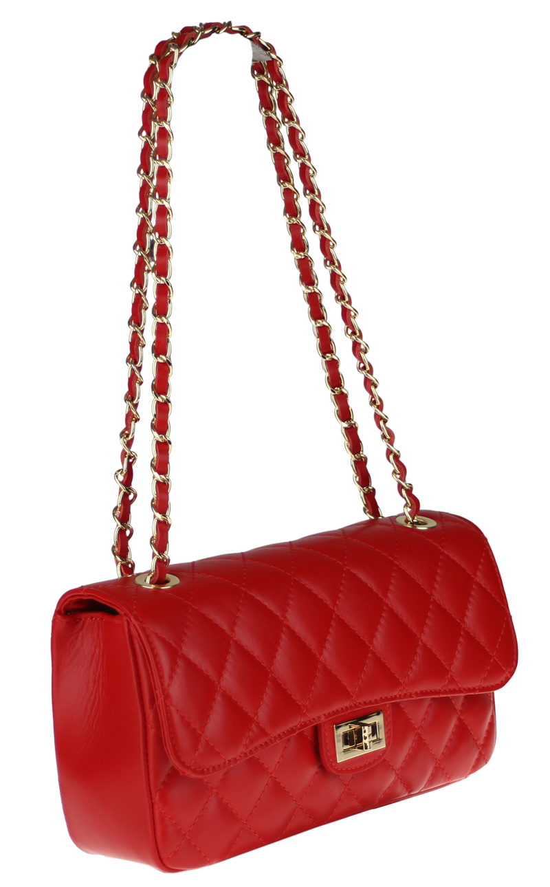 Krásná červená kabelka z měkké kůže. Tato originální kabelka určená k nošení přes rameno je vhodným doplňkem pro pravidelné nošení. Kabelka je uzavíratelná důmyslnou patentkou, která zároveň slouží jako ozdobný prvek. Uvnitř kabelky nalezneme kapsu na zip. Délka řetízku (zlaté barvy) je přes rameno je 120 cm.