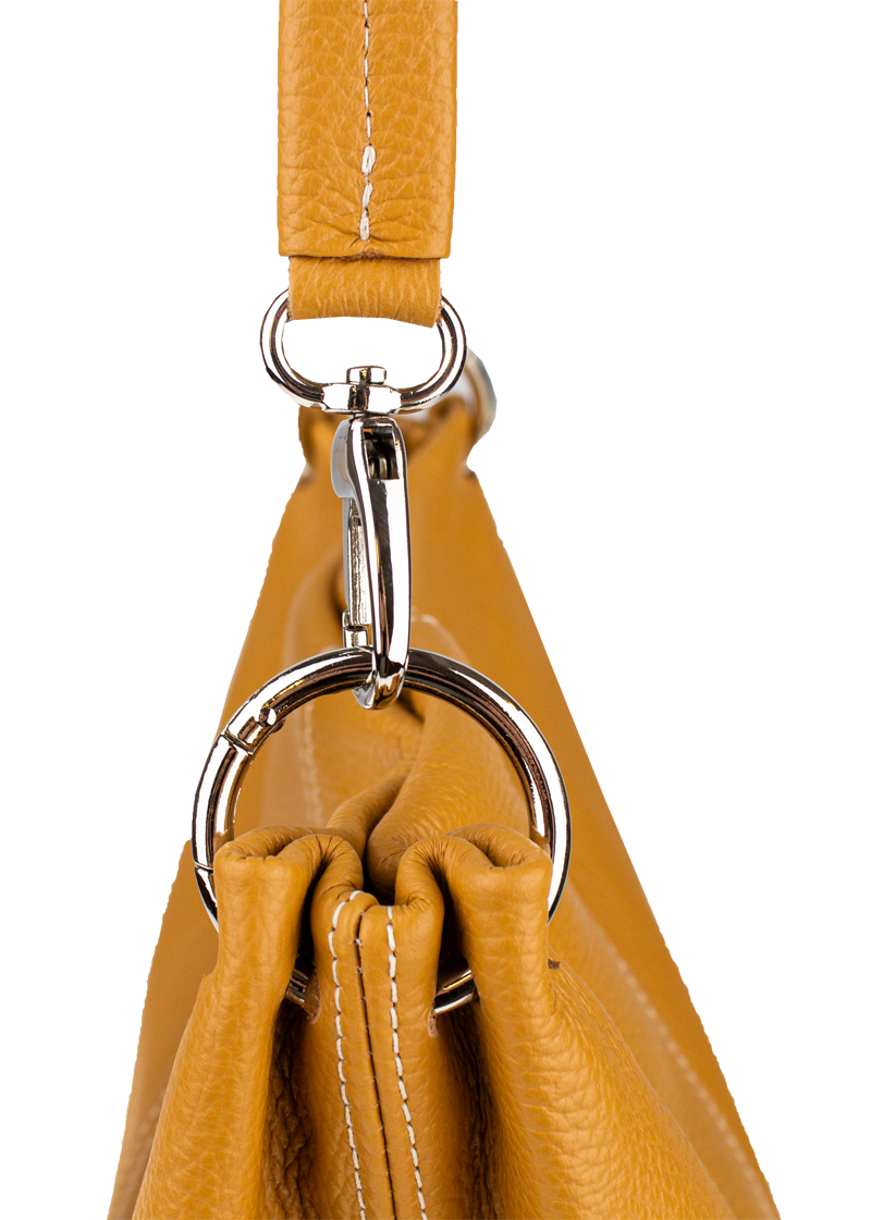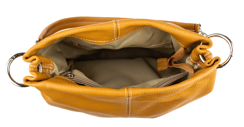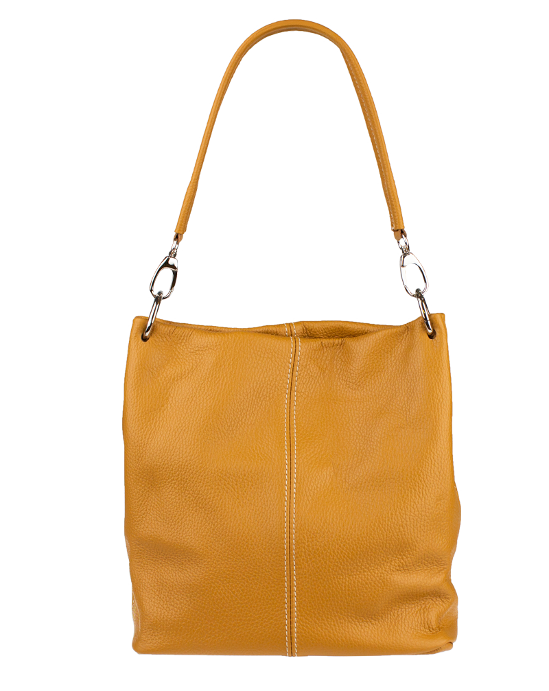 Klasická praktická kabelka s jednoduchým designem v camel barvě. Nositelná přes rameno. Kabelka je uzavíratelná na zip a je vyrobena z pravé poctové kůže. Uvnitř kabelky najdeme přepážku uprostřed, která zároveň slouží jako kapsa na zip, a na bočních stěnách pak kapsu na zip a na druhé straně další malou kapsu. Hloubka její dna činí 14,5 cm.