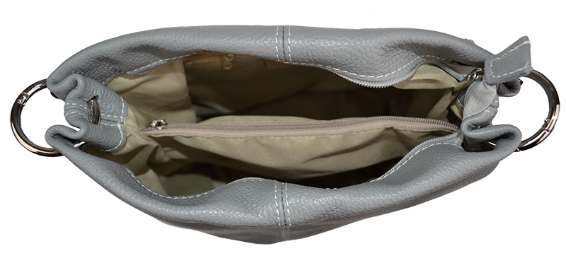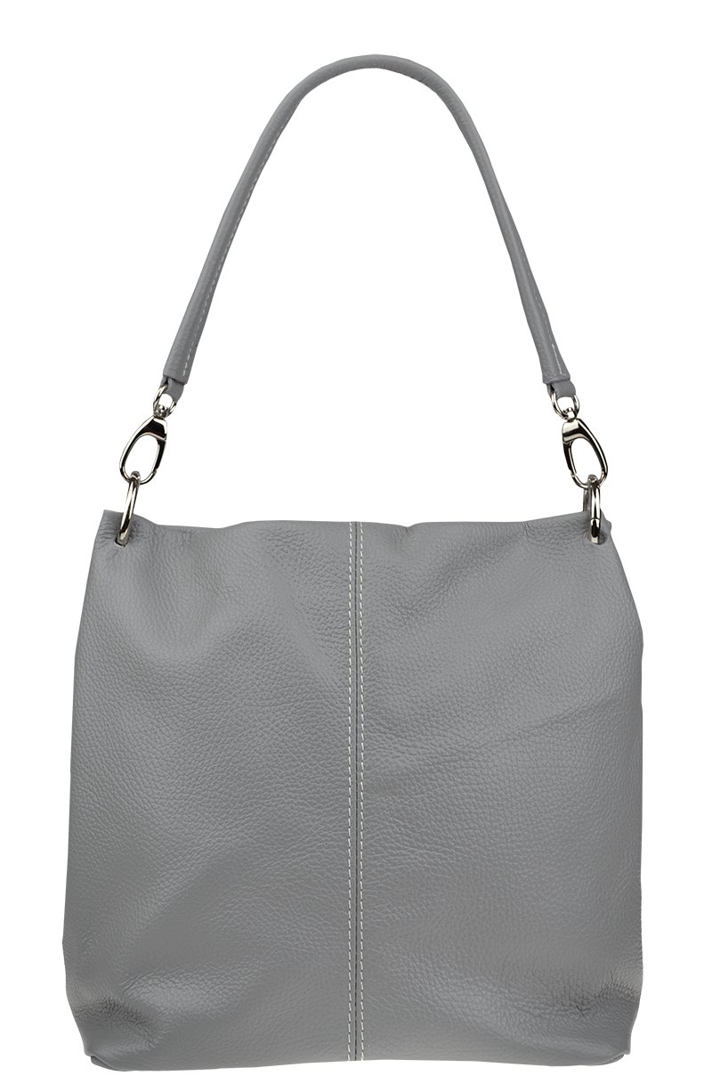 Klasická praktická kabelka s jednoduchým designem v šedivé barvě. Nositelná přes rameno. Kabelka je uzavíratelná na zip a je vyrobena z pravé poctové kůže. Uvnitř kabelky najdeme přepážku uprostřed, která zároveň slouží jako kapsa na zip, a na bočních stěnách pak kapsu na zip a na druhé straně další malou kapsu. Hloubka její dna činí 14,5 cm.