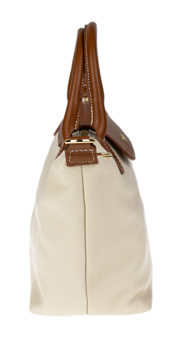 Kabelka je vyrobena z kvalitní pravé kůže s jemnou zrnitou strukturou, která je nejen příjemná na dotek, ale také odolná vůči poškrábání. Design sází na osvědčenou kombinaci béžové barvy těla kabelky s kontrastními detaily v koňakovém odstínu (ucha, klopa, popruh). Celkový luxusní dojem doplňuje decentní zlaté kování a precizní světlé prošívání.