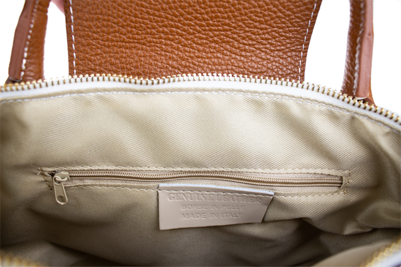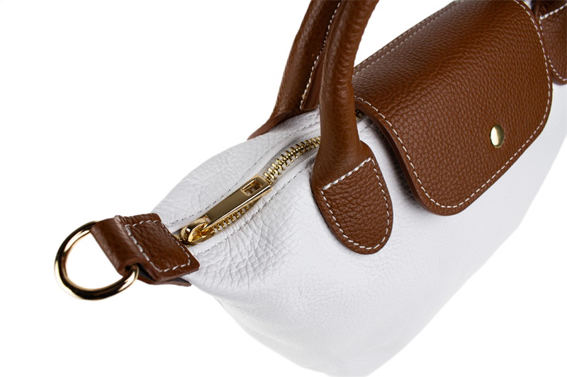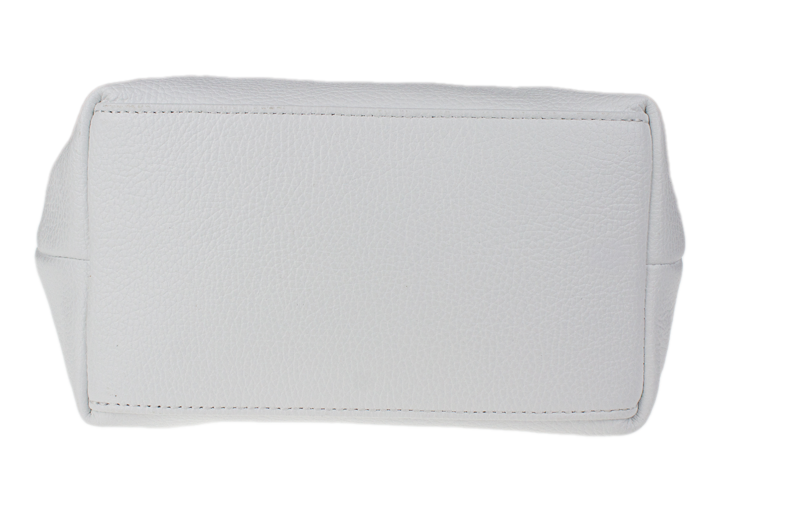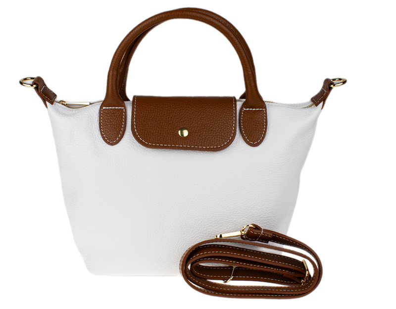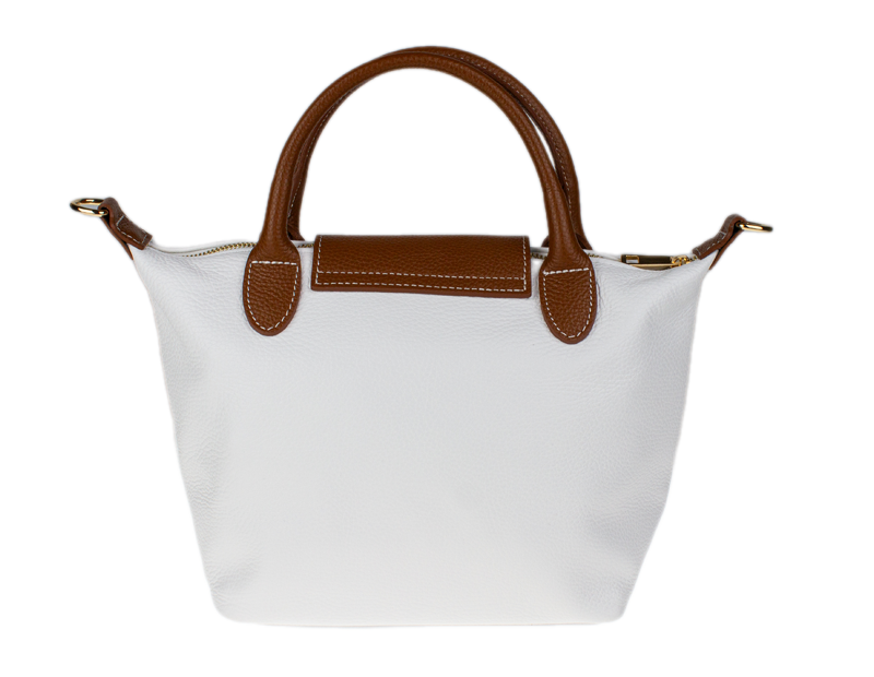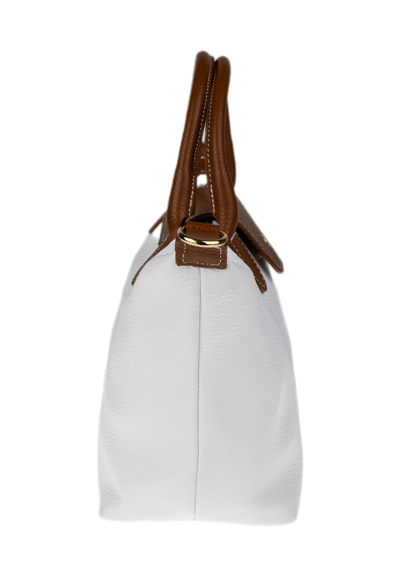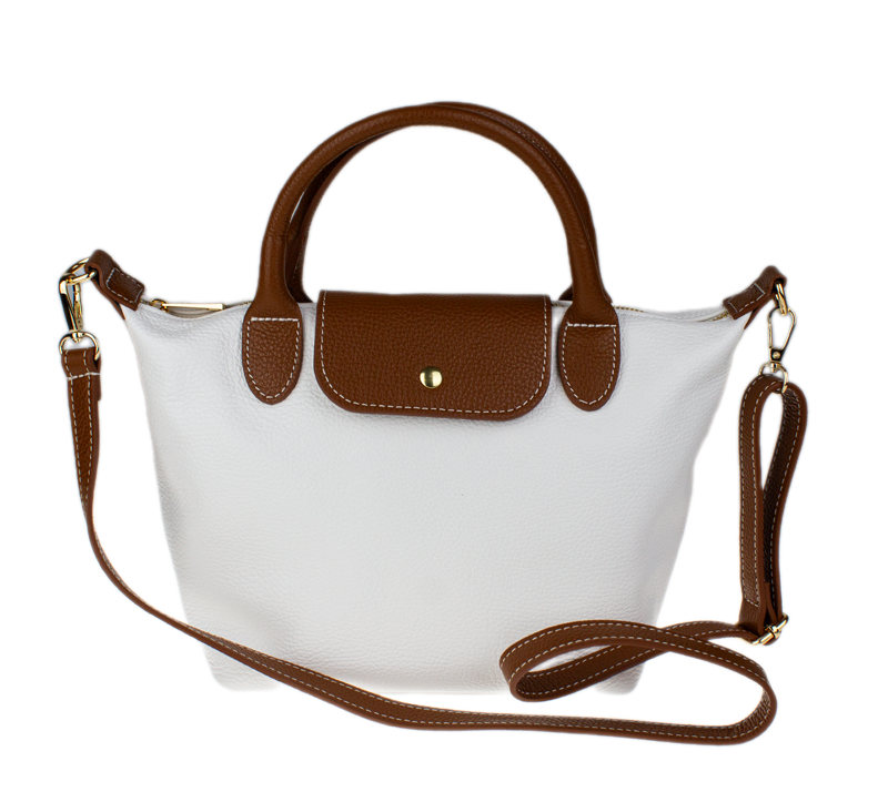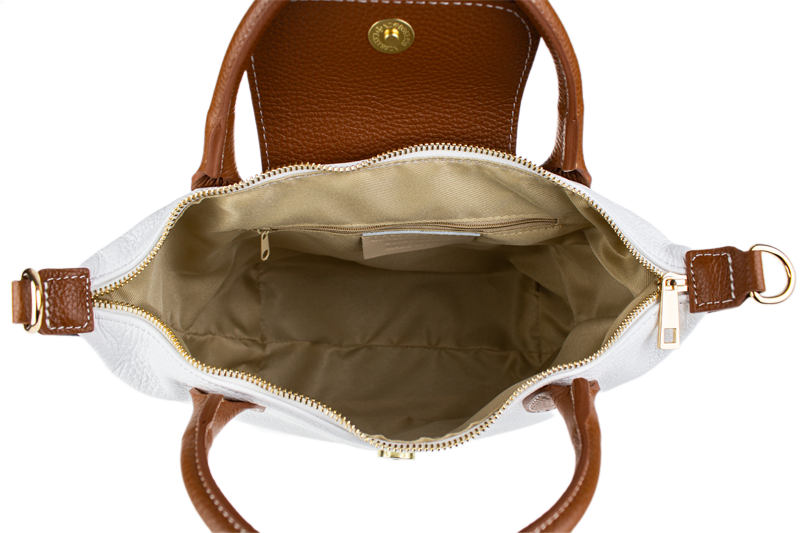 Kabelka je vyrobena z kvalitní pravé kůže s jemnou zrnitou strukturou, která je nejen příjemná na dotek, ale také odolná vůči poškrábání. Design sází na osvědčenou kombinaci bílé barvy těla kabelky s kontrastními detaily v koňakovém odstínu (ucha, klopa, popruh). Celkový luxusní dojem doplňuje decentní zlaté kování a precizní světlé prošívání.