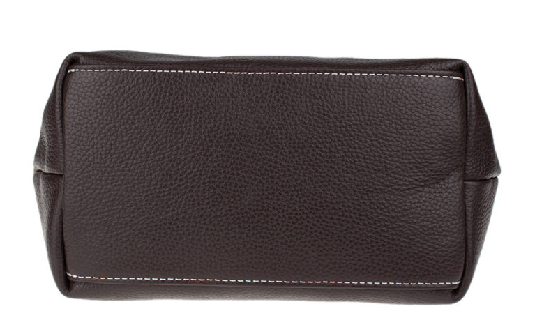 Kabelka je vyrobena z kvalitní pravé kůže s jemnou zrnitou strukturou, která je nejen příjemná na dotek, ale také odolná vůči poškrábání. Design sází na osvědčenou kombinaci tmavě hnědé barvy těla kabelky s kontrastními detaily v koňakovém odstínu (ucha, klopa, popruh). Celkový luxusní dojem doplňuje decentní zlaté kování a precizní světlé prošívání.