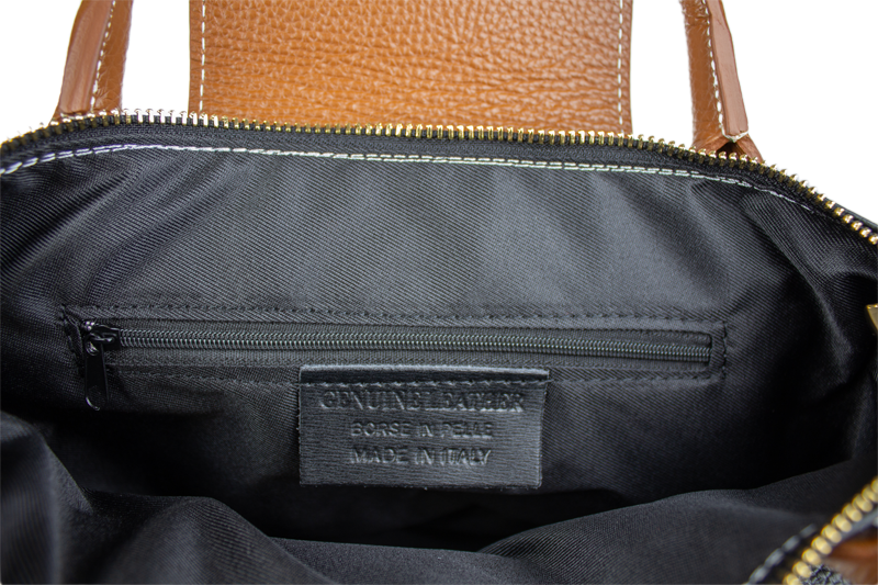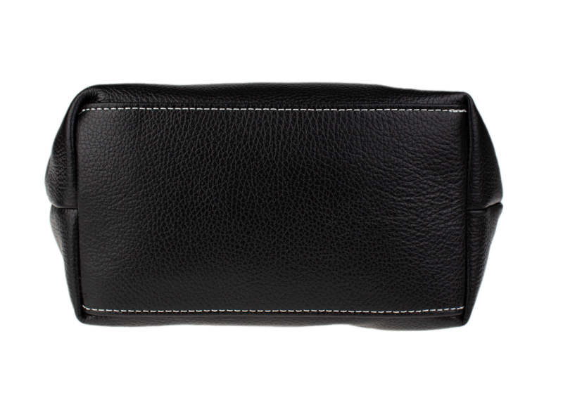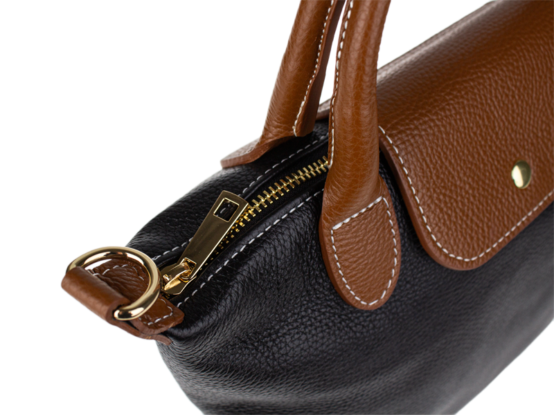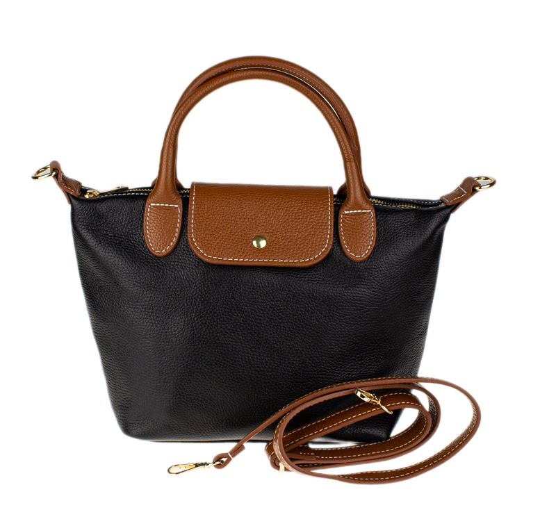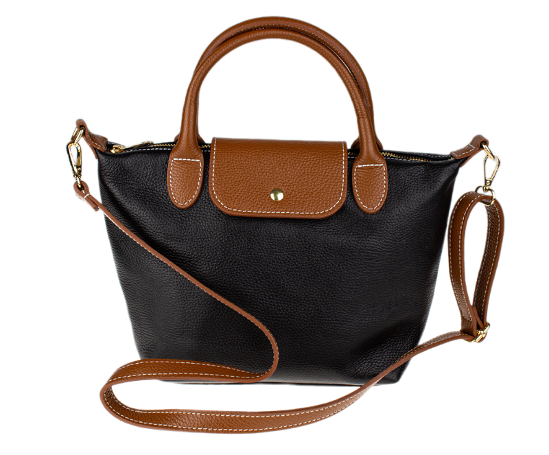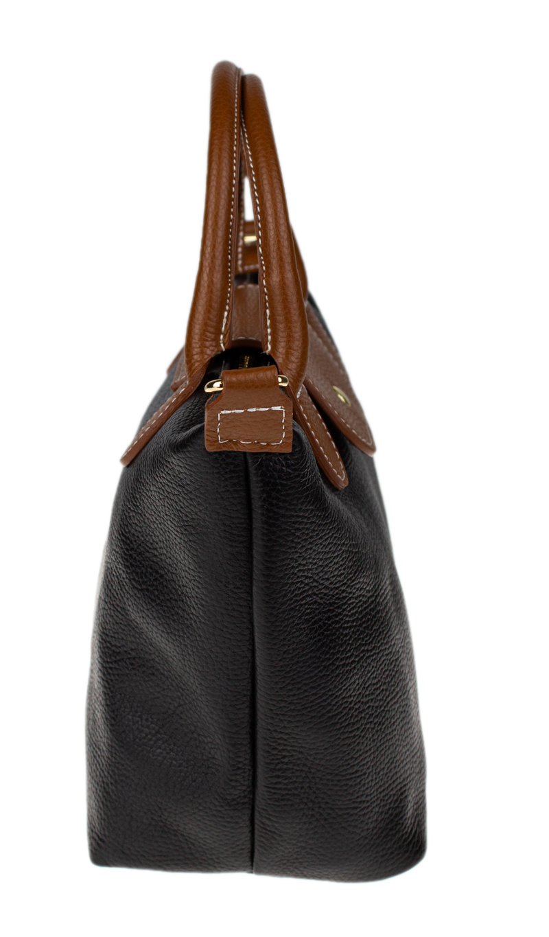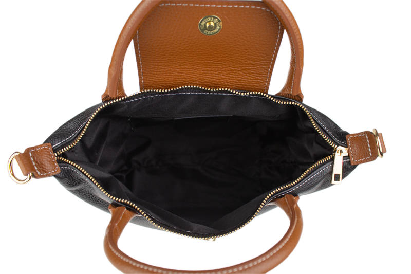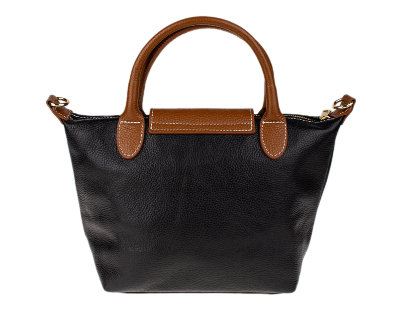 Kabelka je vyrobena z kvalitní pravé kůže s jemnou zrnitou strukturou, která je nejen příjemná na dotek, ale také odolná vůči poškrábání. Design sází na osvědčenou kombinaci černé barvy těla kabelky s kontrastními detaily v koňakovém odstínu (ucha, klopa, popruh). Celkový luxusní dojem doplňuje decentní zlaté kování a precizní světlé prošívání.