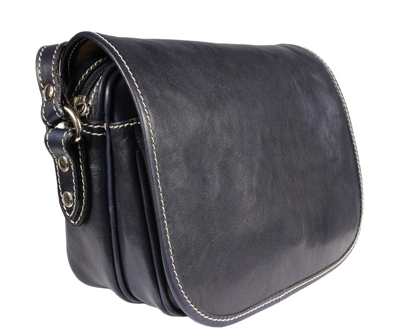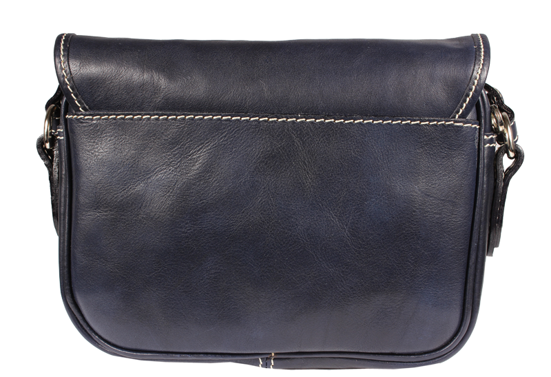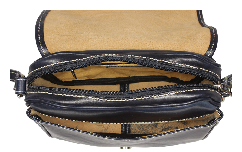 Kožená kabelka v modré barvě. Kabelka se uzavírá pomocí poklopu na patentky. Uvnitř kabelky jsou dvě přihrádky a zavírací kapsa na zip. Délka popruhu je 110 cm. Další barevné varianty naleznete zde.
