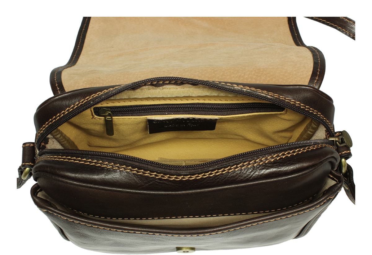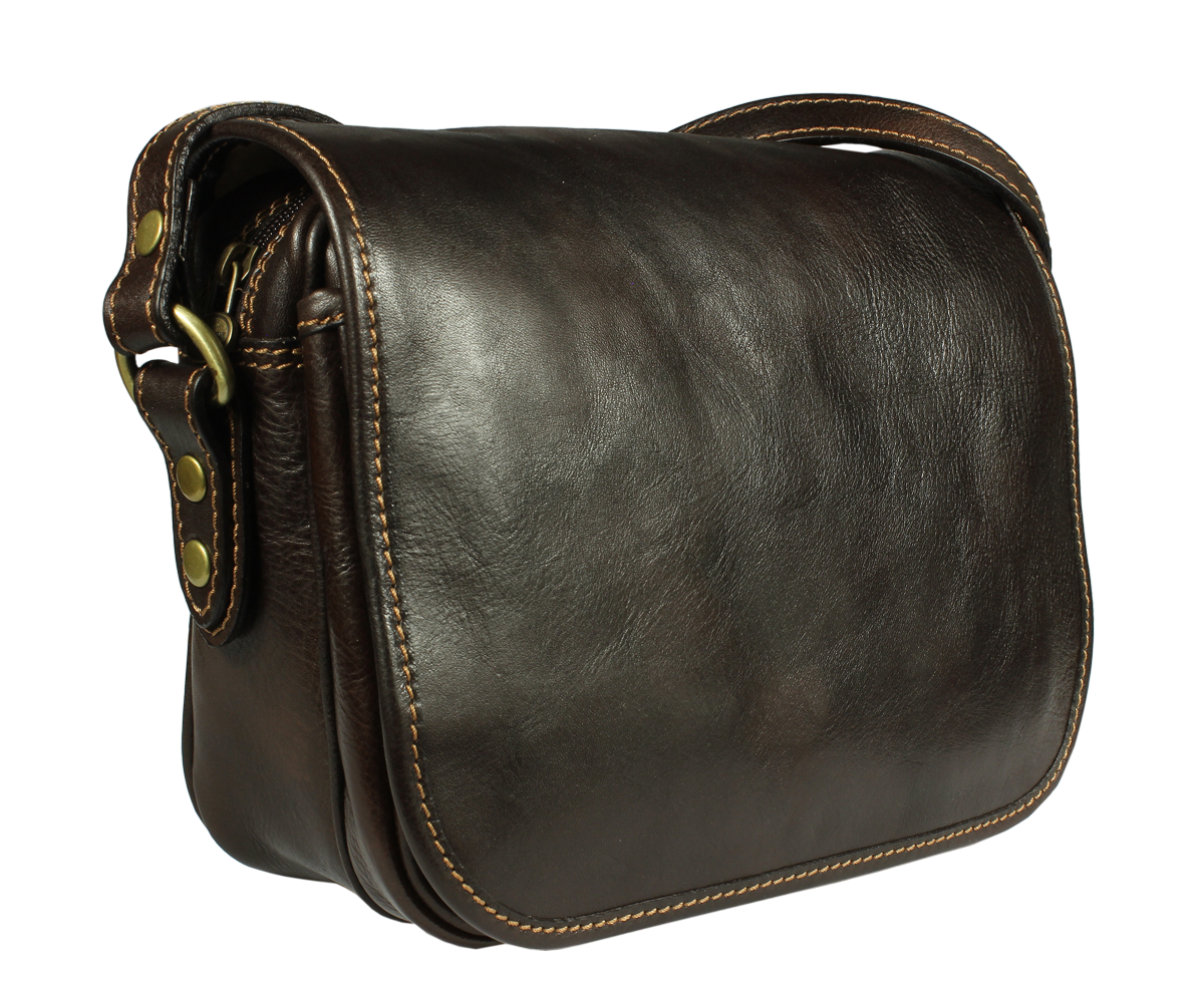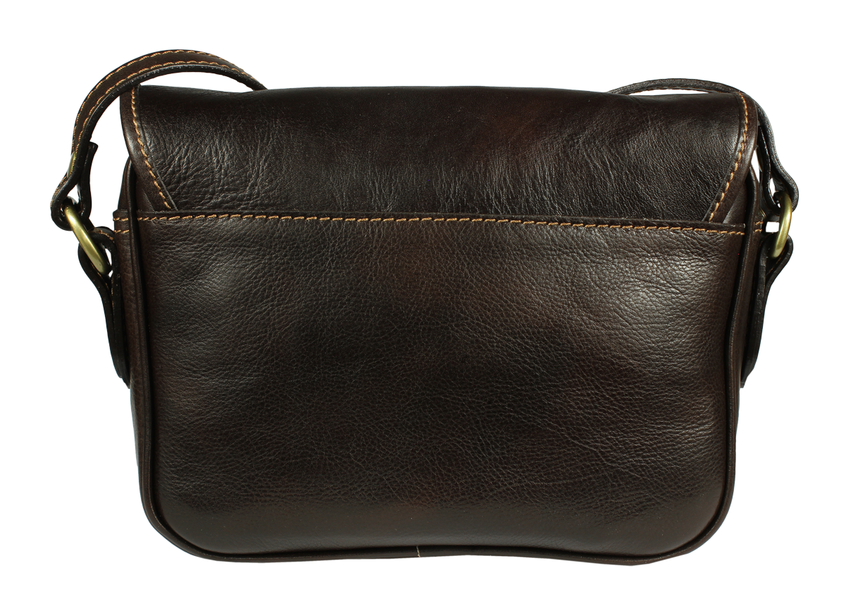 Kožená kabelka v tmavě hnědé barvě. Kabelka se uzavírá pomocí poklopu na patentky. Uvnitř kabelky jsou dvě přihrádky a zavírací kapsa na zip. Délka popruhu je 110 cm. Další barevné varianty naleznete zde.