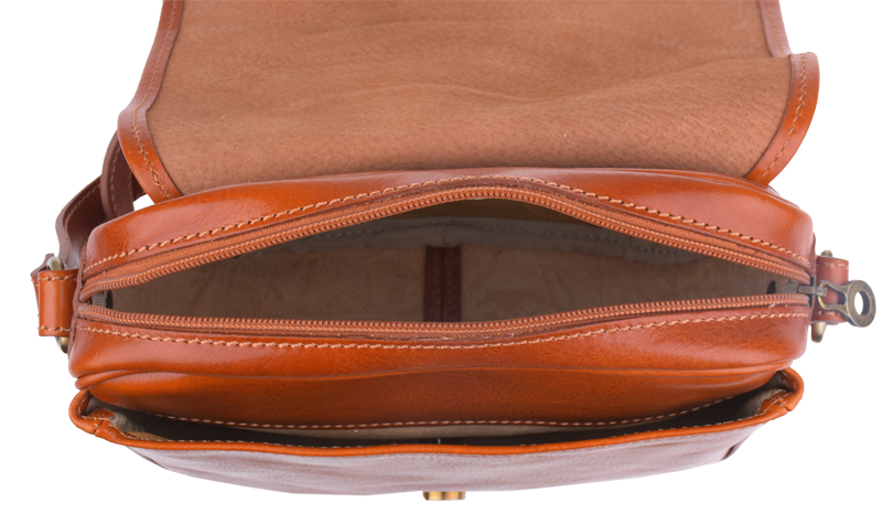 Kožená kabelka v camel barvě. Kabelka se uzavírá pomocí poklopu na patentky. Uvnitř kabelky jsou dvě přihrádky a zavírací kapsa na zip. Délka popruhu je 110 cm. Další barevné varianty naleznete zde.