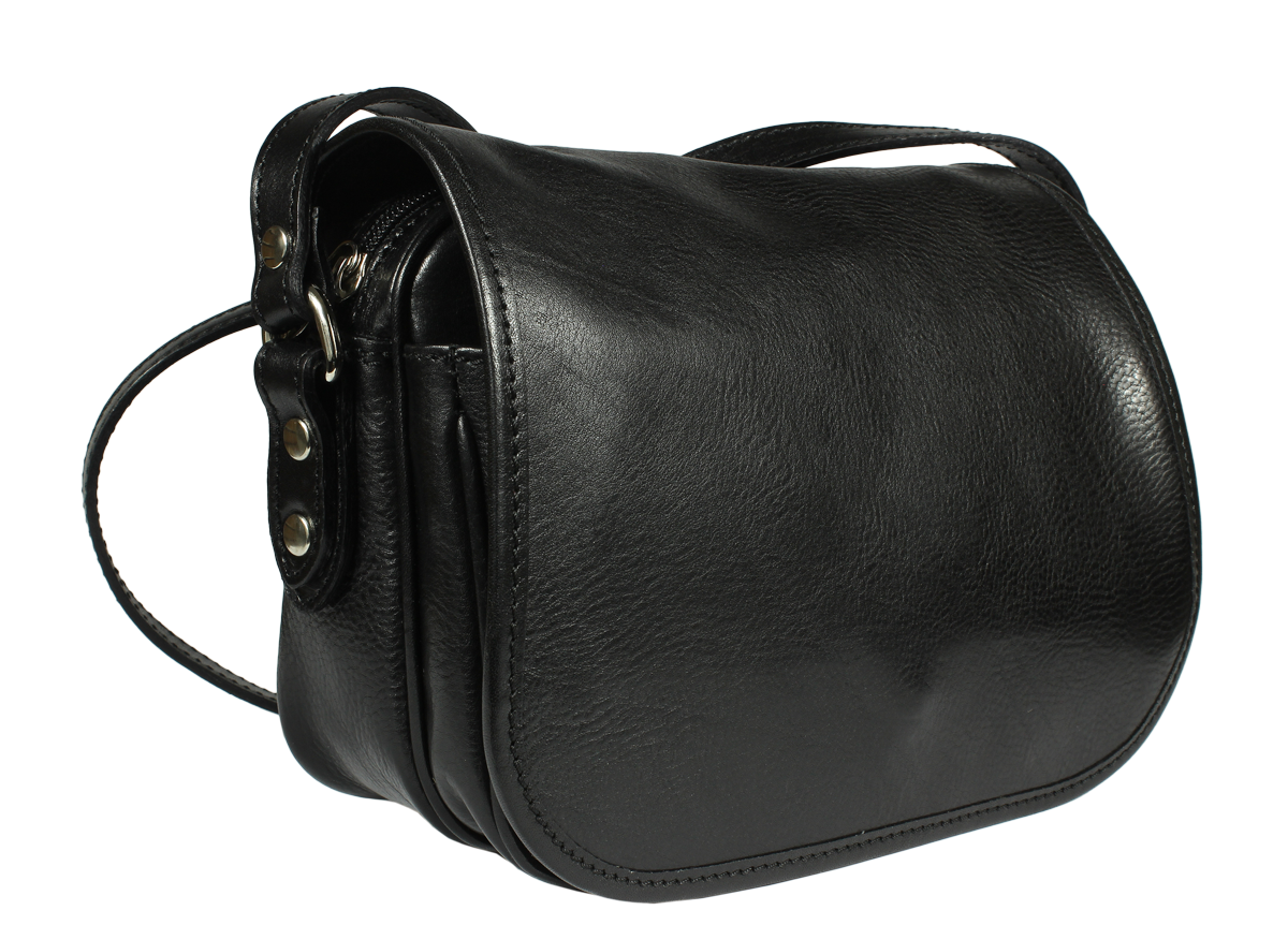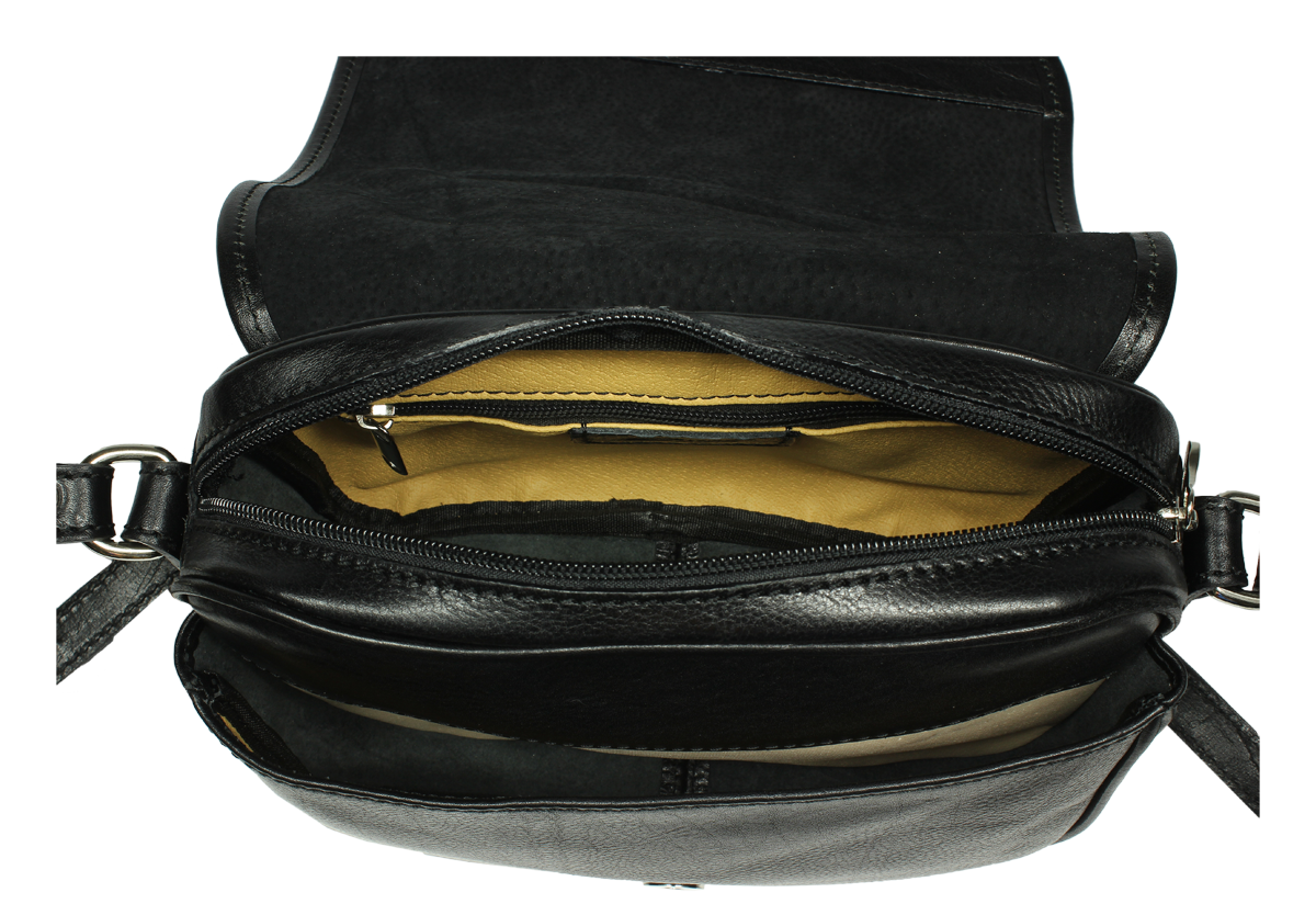 Kožená kabelka v černé barvě. Kabelka se uzavírá pomocí poklopu na patentky. Uvnitř kabelky jsou dvě přihrádky a zavírací kapsa na zip. Délka popruhu je 110 cm. Další barevné varianty naleznete zde.