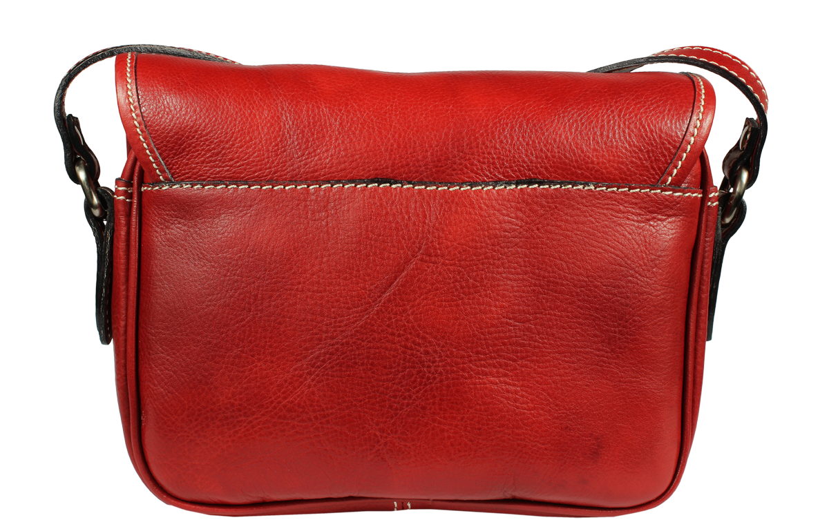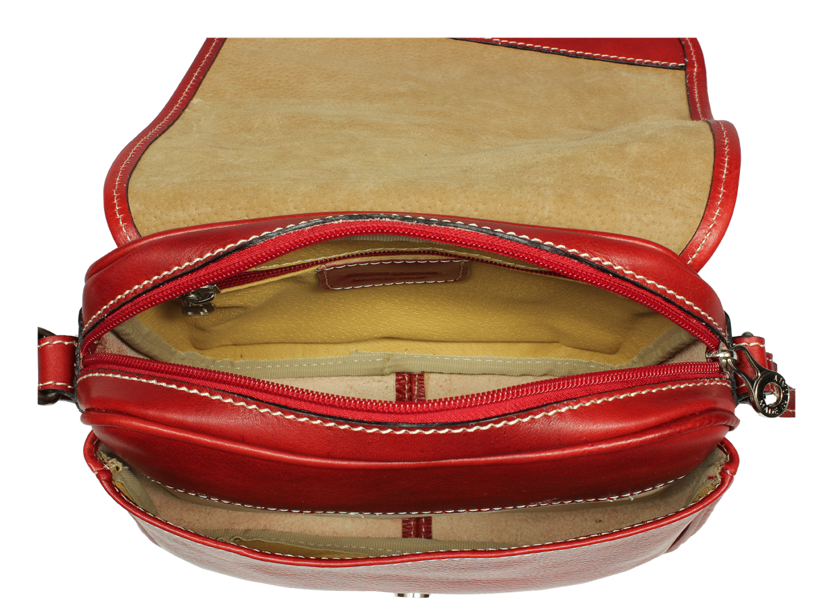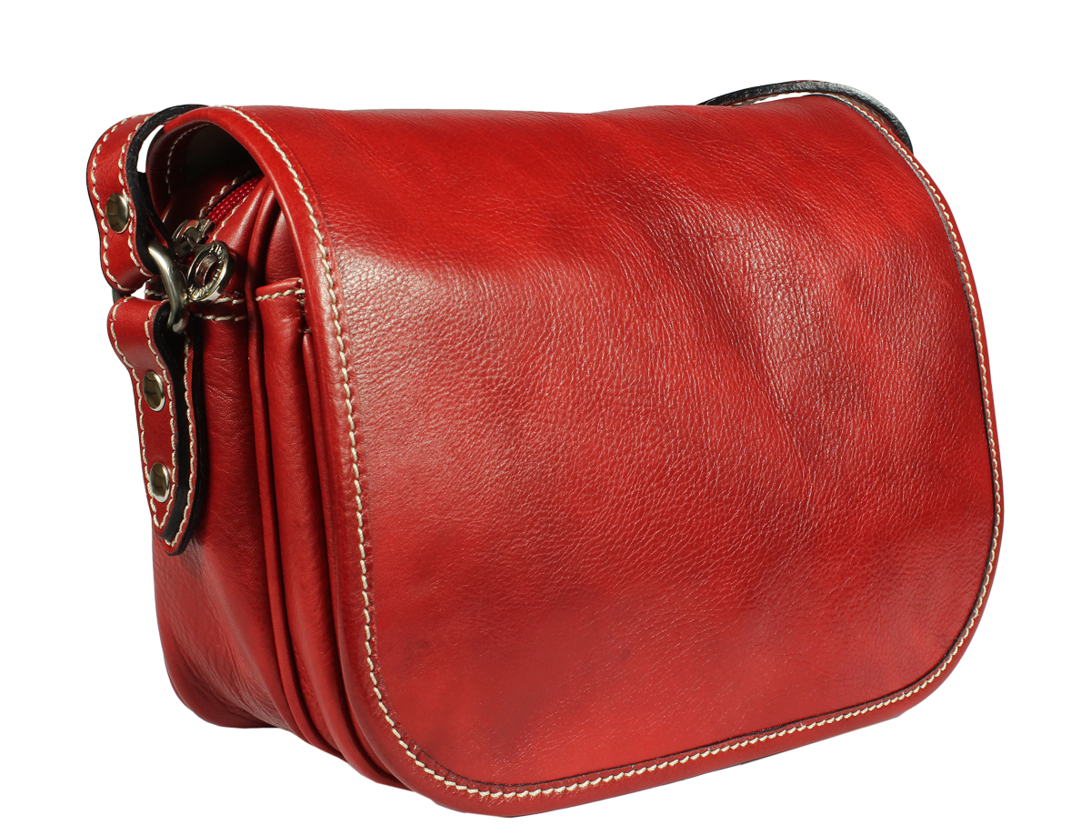 Kožená kabelka v červené barvě. Kabelka se uzavírá pomocí poklopu na patentky. Uvnitř kabelky jsou dvě přihrádky a zavírací kapsa na zip. Délka popruhu je 110 cm. Další barevné varianty naleznete zde.