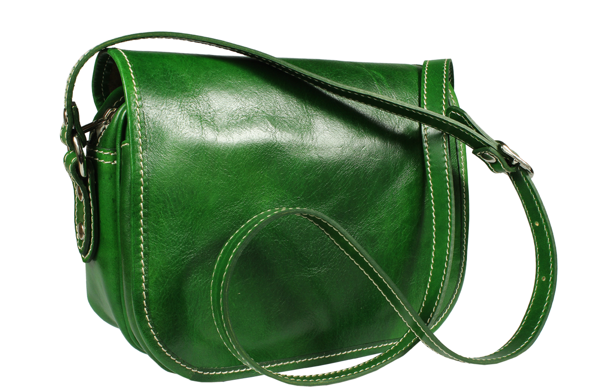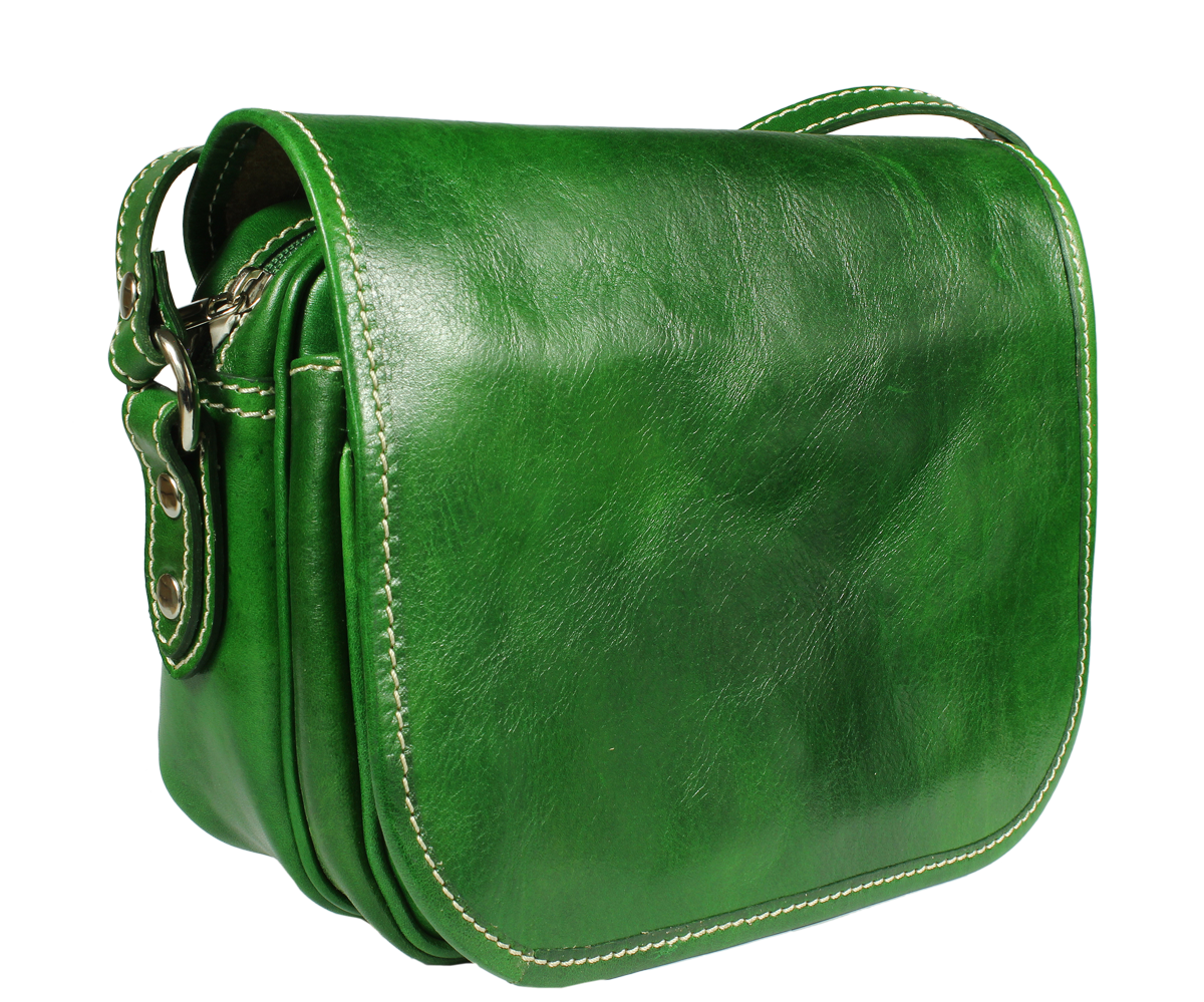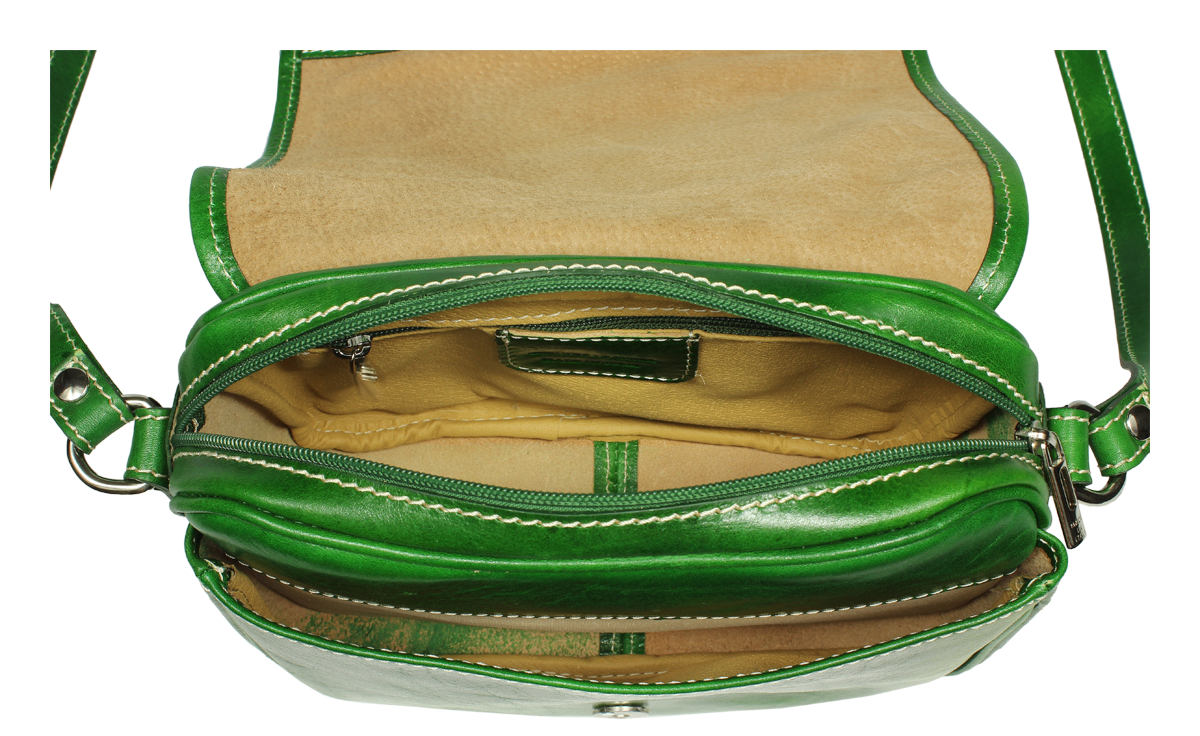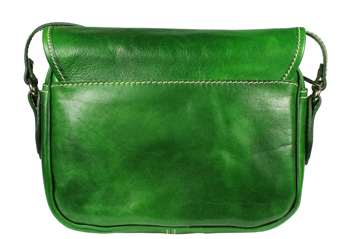 Kožená kabelka v zelené barvě. Kabelka se uzavírá pomocí poklopu na patentky. Uvnitř kabelky jsou dvě přihrádky a zavírací kapsa na zip. Délka popruhu je 110 cm. Další barevné varianty naleznete zde.