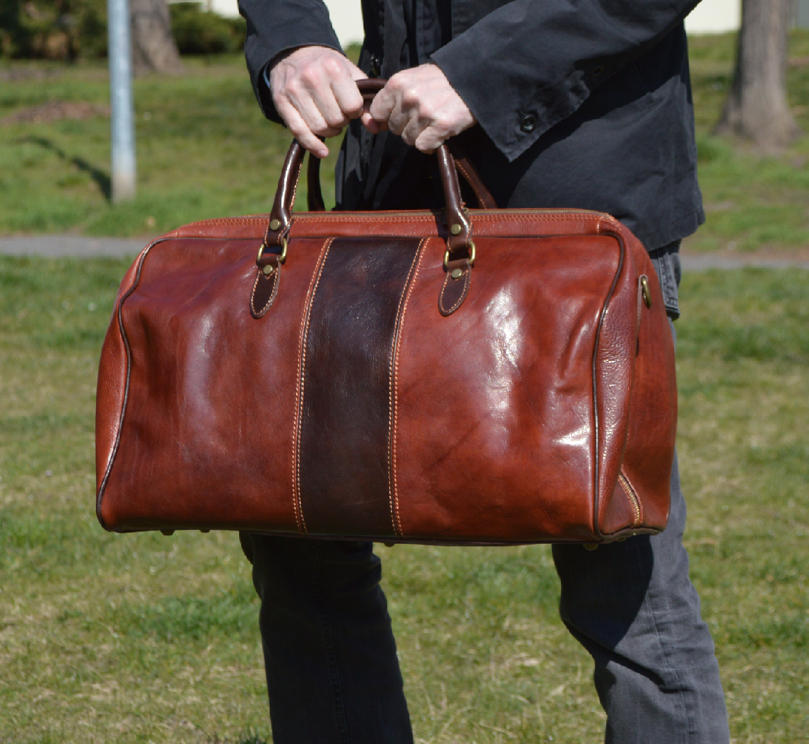 Luxusní kožená cestovní taška v hnědé barvě. Taška je vyrobena z hladké kvalitní Italské kůže s voskovanou úpravou, která dodává tašce úžasnou patinu. Součástí tašky je přídavný popruh o délce 107 cm. Taška se uzavírá kovovým zipem. Cestujte stylově s koženou taškou!