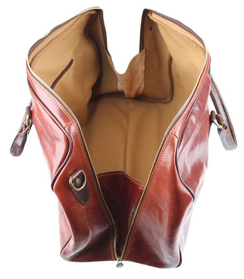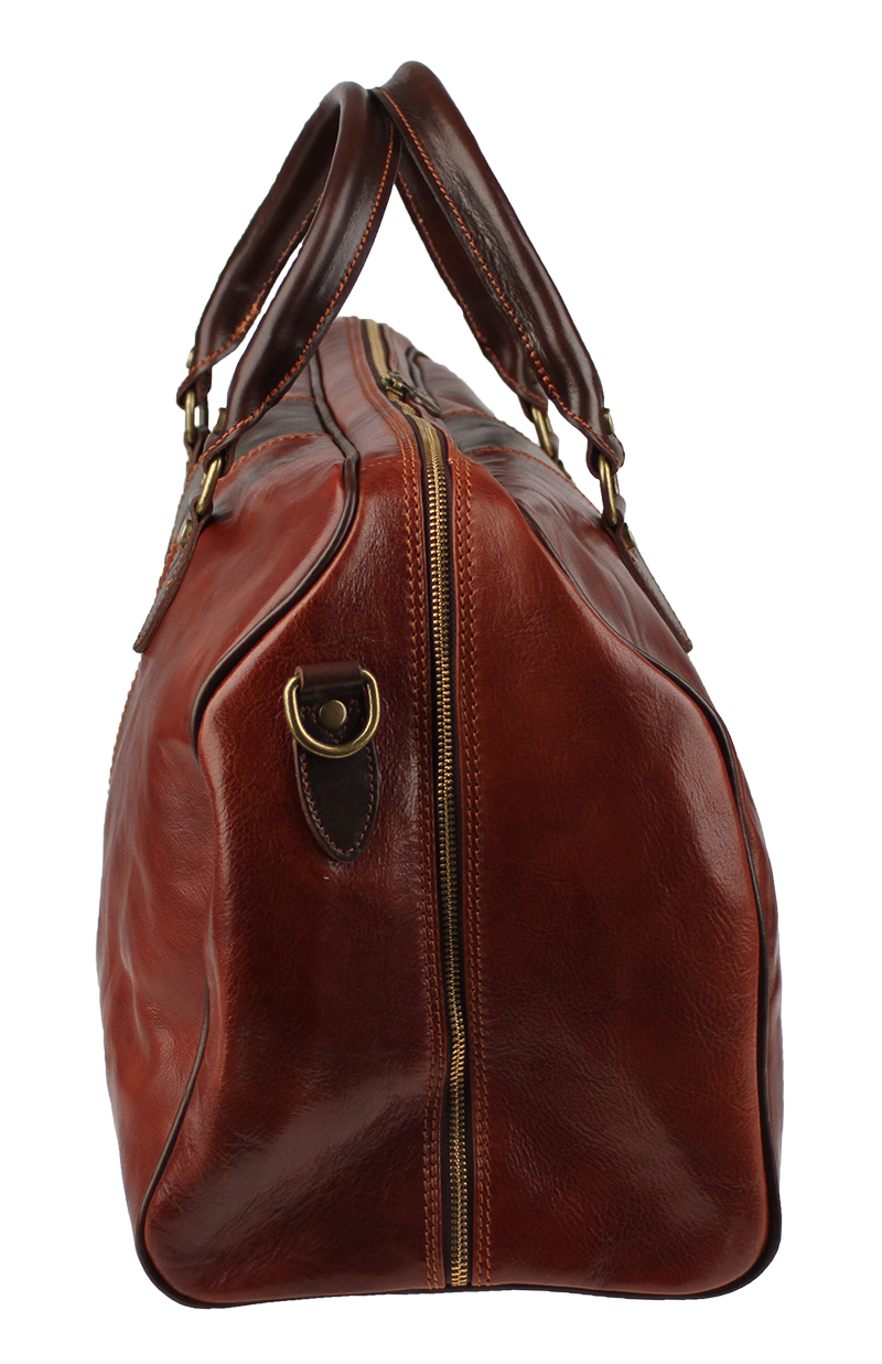 Luxusní kožená cestovní taška v hnědé barvě. Taška je vyrobena z hladké kvalitní Italské kůže. Součástí tašky je přídavný popruh o délce 107 cm. Taška se uzavírá kovovým zipem. Cestujte stylově s koženou taškou!