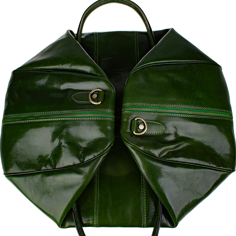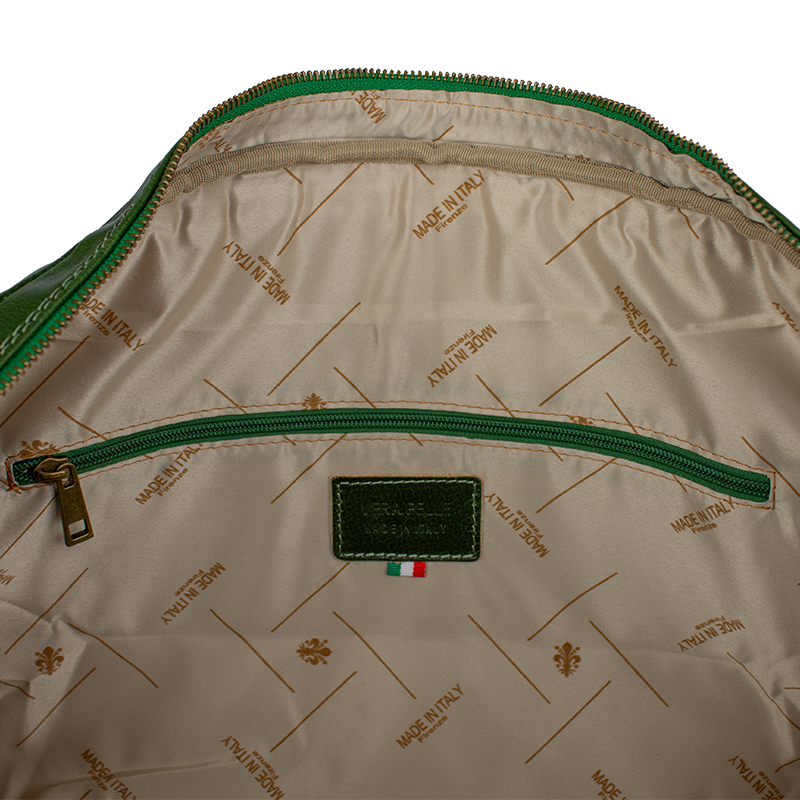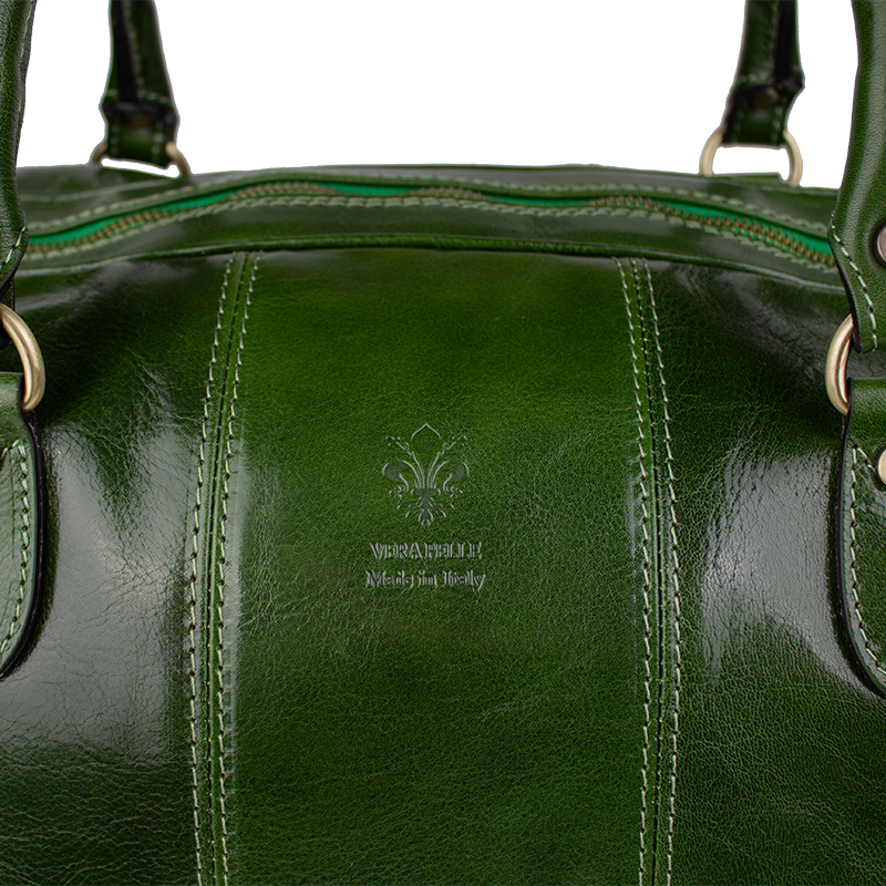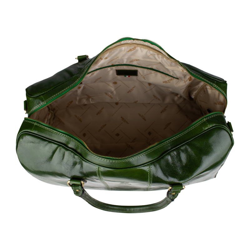 Luxusní kožená cestovní taška v zelené barvě. Taška je vyrobena z hladké kvalitní Italské kůže. Součástí tašky je přídavný popruh o délce 107 cm. Taška se uzavírá kovovým zipem. Cestujte stylově s koženou taškou!