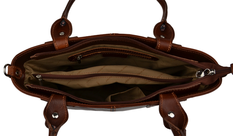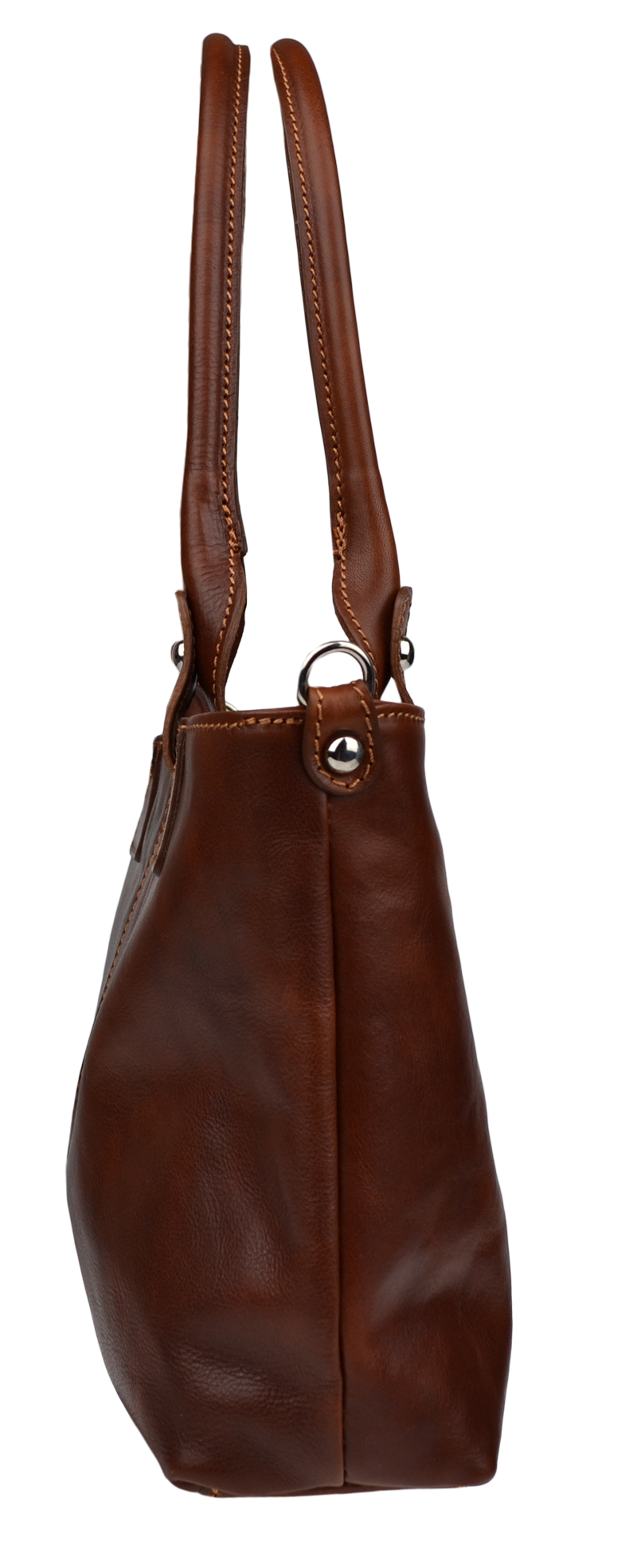 Praktická a prostorná kožená kabelka v hnědé barvě. Jednoduché provedení a velký prostor dělá tuto kabelku neobyčejně praktickou pro denní nošení. Vnitřek kabelky je vybaven kapsou na zip a dvěma malými přihrádkami.
