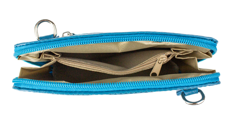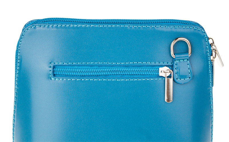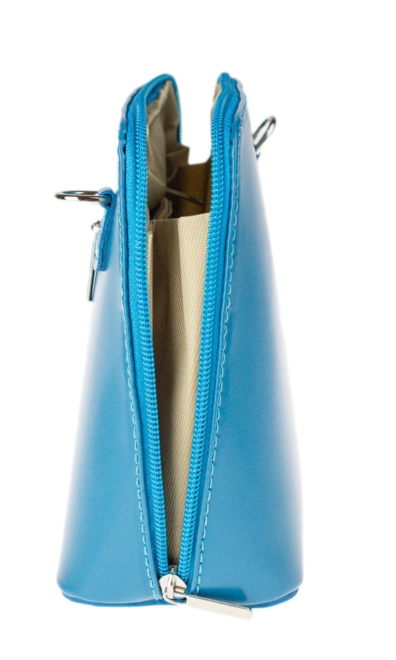 Elegantní, ale zároveň velmi praktická modrá kabelka malých rozměrů vyrobena z pravé kůže. Díky tenkému pásku je nositelná přes rameno. Zip, kterým se uzavírá, vede po hraně kabelky až po spodní okraj na obou stranách, a proto je její vnitřek dobře dostupný. Na vnější zadní straně najdete na kabelce malou kapsu na zip a uvnitř dělí celý prostor na dvě části příčka, která současně slouží jako kapsa na zip. Hloubka jejího dna je 8 cm. Délka přídavného popruhu je cca 120 cm.