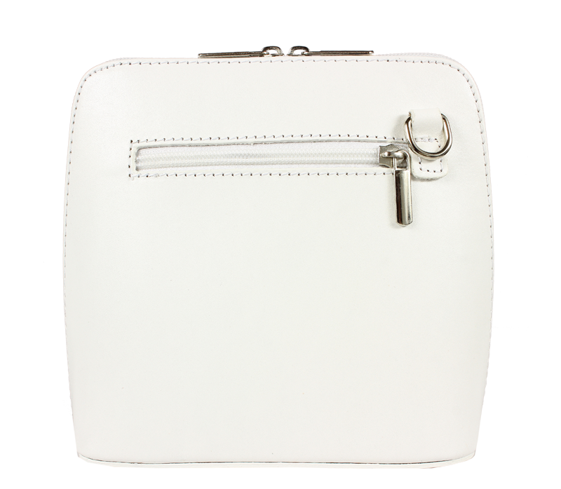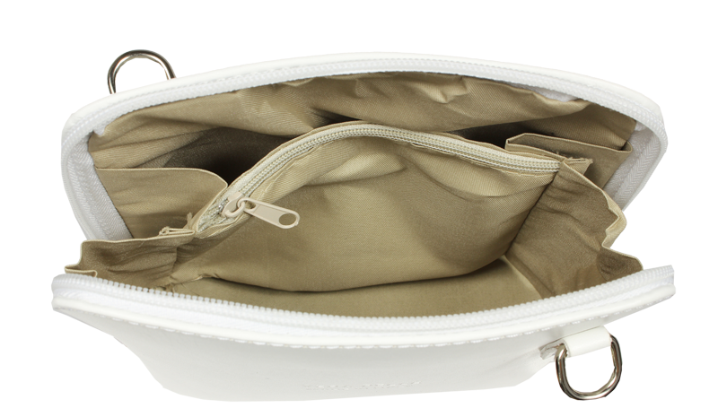 Elegantní, ale zároveň velmi praktická bílá kabelka malých rozměrů vyrobena z pravé kůže. Díky tenkému pásku je nositelná přes rameno. Zip, kterým se uzavírá, vede po hraně kabelky až po spodní okraj na obou stranách, a proto je její vnitřek dobře dostupný. Na vnější zadní straně najdete na kabelce malou kapsu na zip a uvnitř dělí celý prostor na dvě části příčka, která současně slouží jako kapsa na zip. Hloubka jejího dna je 8 cm. Délka přídavného popruhu je cca 120 cm.