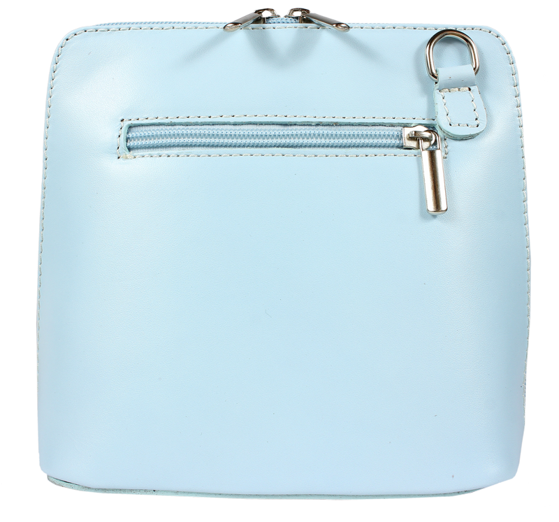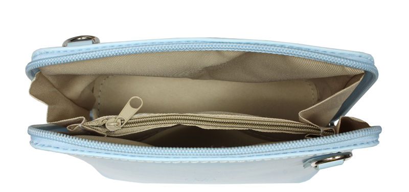 Elegantní, ale zároveň velmi praktická modrá kabelka malých rozměrů vyrobena z pravé kůže. Díky tenkému pásku je nositelná přes rameno. Zip, kterým se uzavírá, vede po hraně kabelky až po spodní okraj na obou stranách, a proto je její vnitřek dobře dostupný. Na vnější zadní straně najdete na kabelce malou kapsu na zip a uvnitř dělí celý prostor na dvě části příčka, která současně slouží jako kapsa na zip. Hloubka jejího dna je 8 cm. Délka přídavného popruhu je cca 120 cm.