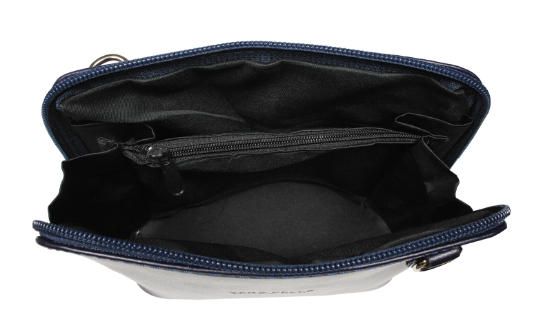 Elegantní, ale zároveň velmi praktická modrá kabelka malých rozměrů vyrobena z pravé kůže. Díky tenkému pásku je nositelná přes rameno. Zip, kterým se uzavírá, vede po hraně kabelky až po spodní okraj na obou stranách, a proto je její vnitřek dobře dostupný. Na vnější zadní straně najdete na kabelce malou kapsu na zip a uvnitř dělí celý prostor na dvě části příčka, která současně slouží jako kapsa na zip. Hloubka jejího dna je 8 cm. Délka přídavného popruhu je cca 120 cm.