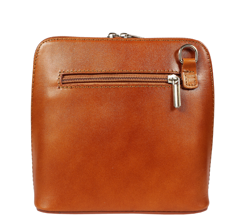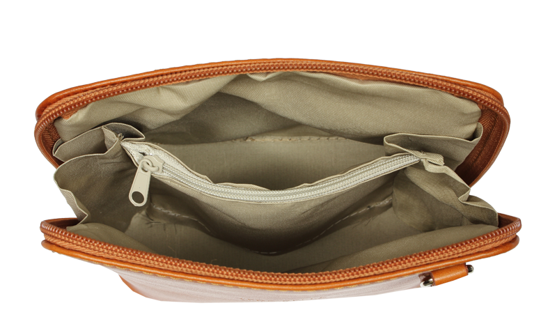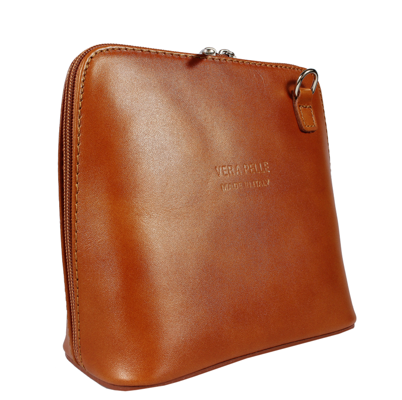 Elegantní, ale zároveň velmi praktická camel kabelka malých rozměrů vyrobena z pravé kůže. Díky tenkému pásku je nositelná přes rameno. Zip, kterým se uzavírá, vede po hraně kabelky až po spodní okraj na obou stranách, a proto je její vnitřek dobře dostupný. Na vnější zadní straně najdete na kabelce malou kapsu na zip a uvnitř dělí celý prostor na dvě části příčka, která současně slouží jako kapsa na zip. Hloubka jejího dna je 8 cm. Délka přídavného popruhu je cca 120 cm.