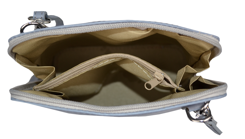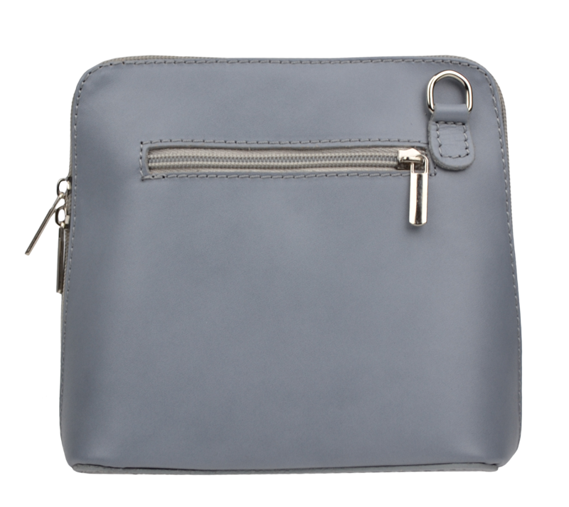 Elegantní, ale zároveň velmi praktická šedá kabelka malých rozměrů vyrobena z pravé kůže. Díky tenkému pásku je nositelná přes rameno. Zip, kterým se uzavírá, vede po hraně kabelky až po spodní okraj na obou stranách, a proto je její vnitřek dobře dostupný. Na vnější zadní straně najdete na kabelce malou kapsu na zip a uvnitř dělí celý prostor na dvě části příčka, která současně slouží jako kapsa na zip. Hloubka jejího dna je 8 cm. Délka přídavného popruhu je cca 120 cm.