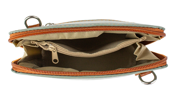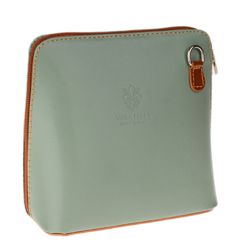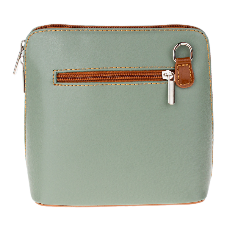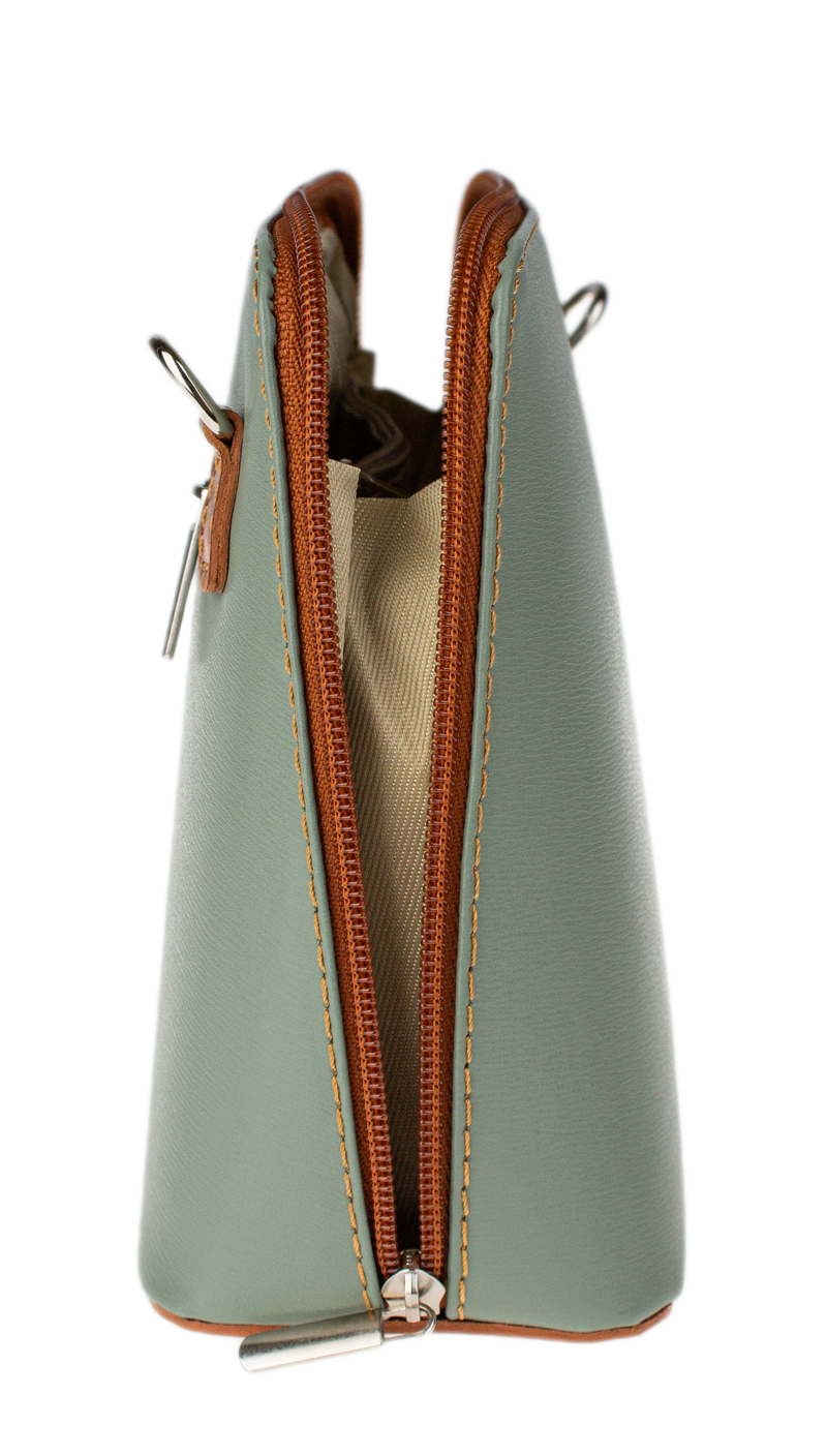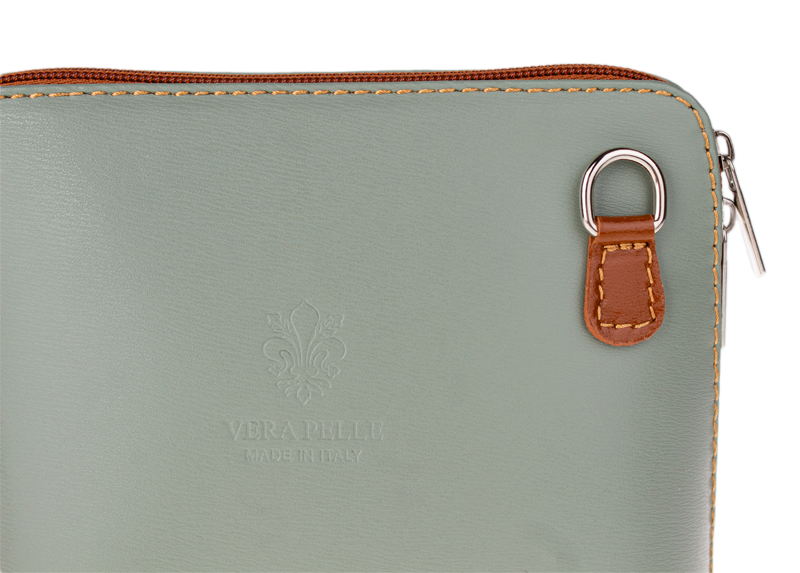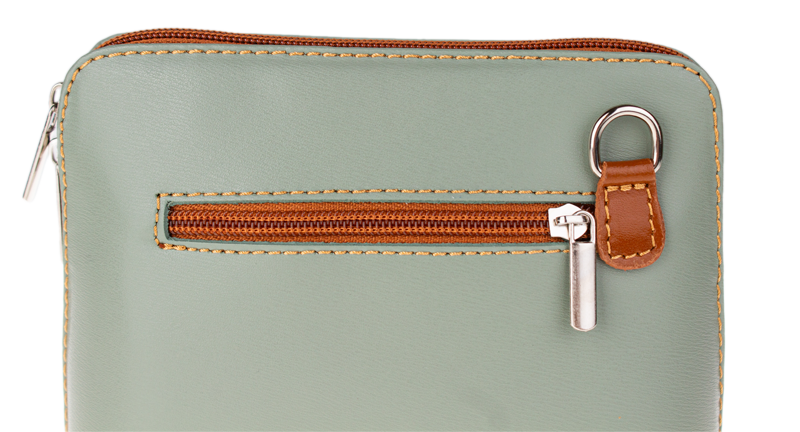 Elegantní, ale zároveň velmi praktická khaki kabelka malých rozměrů vyrobena z pravé kůže. Díky tenkému pásku je nositelná přes rameno. Zip, kterým se uzavírá, vede po hraně kabelky až po spodní okraj na obou stranách, a proto je její vnitřek dobře dostupný. Na vnější zadní straně najdete na kabelce malou kapsu na zip a uvnitř dělí celý prostor na dvě části příčka, která současně slouží jako kapsa na zip. Hloubka jejího dna je 8 cm. Délka přídavného popruhu je cca 120 cm.
