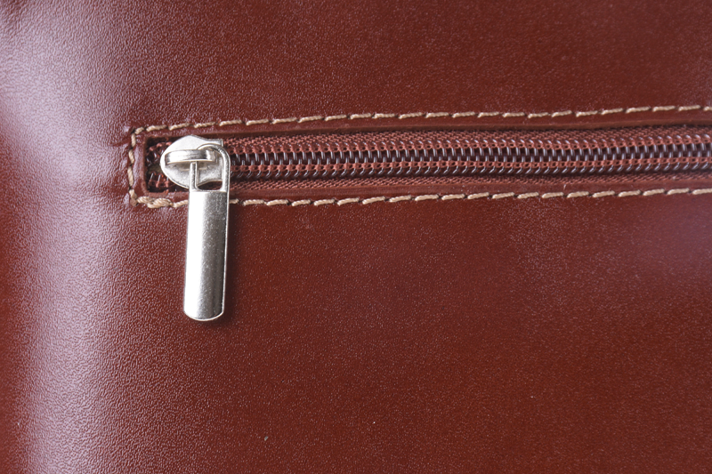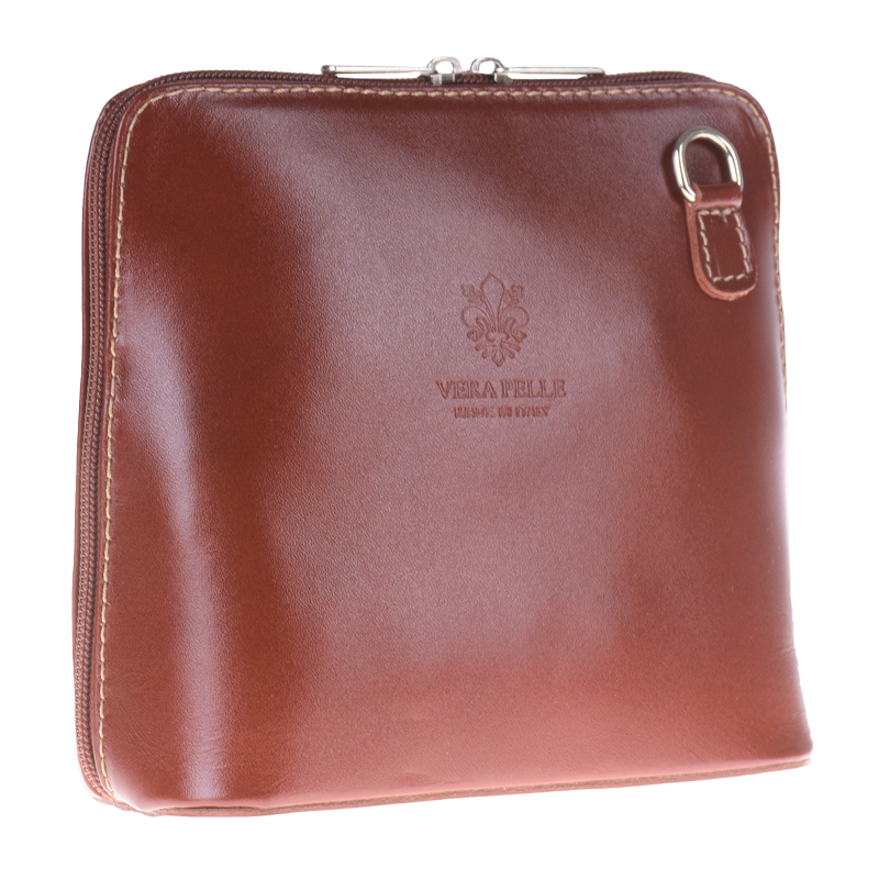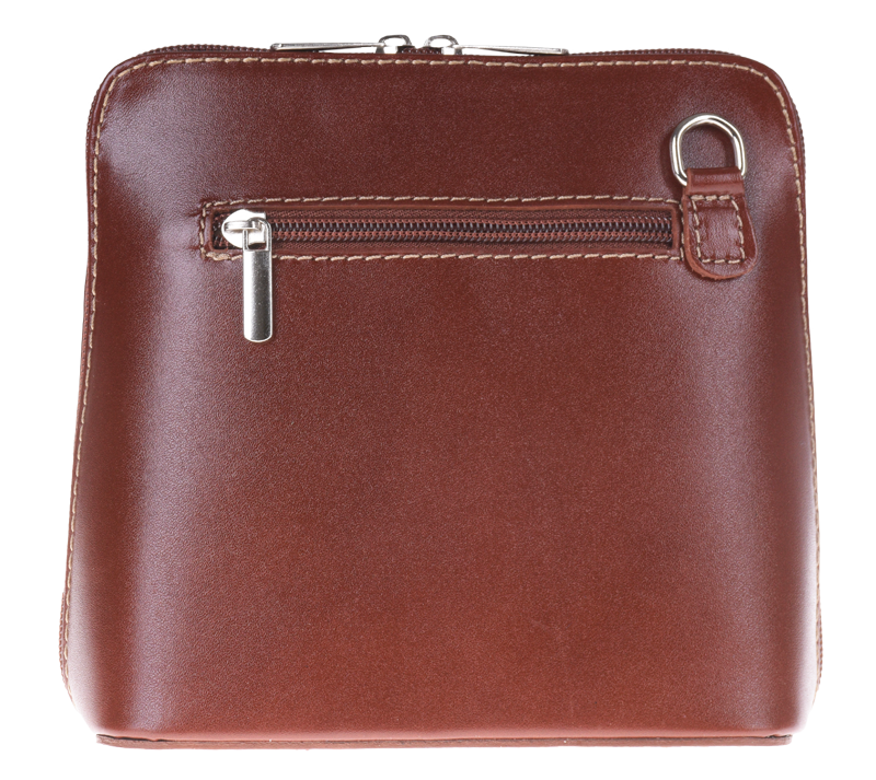 Elegantní, ale zároveň velmi praktická hnědá kabelka malých rozměrů vyrobena z pravé kůže. Díky tenkému pásku je nositelná přes rameno. Zip, kterým se uzavírá, vede po hraně kabelky až po spodní okraj na obou stranách, a proto je její vnitřek dobře dostupný. Na vnější zadní straně najdete na kabelce malou kapsu na zip a uvnitř dělí celý prostor na dvě části příčka, která současně slouží jako kapsa na zip. Hloubka jejího dna je 8 cm. Délka přídavného popruhu je cca 120 cm.