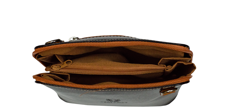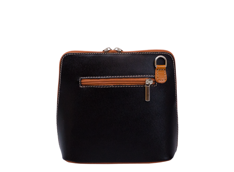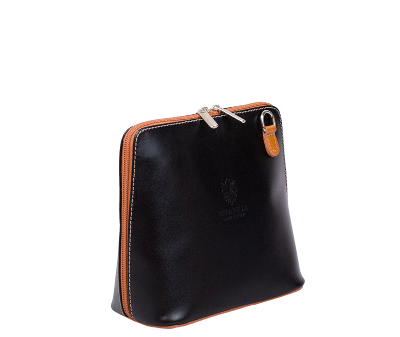 Elegantní, ale zároveň velmi praktická kabelka malých rozměrů vyrobena z pravé černé kůže. Díky tenkému pásku je nositelná přes rameno. Zip, kterým se uzavírá, vede po hraně kabelky až po spodní okraj na obou stranách, a proto je její vnitřek dobře dostupný. Na vnější zadní straně najdete na kabelce malou kapsu na zip a uvnitř dělí celý prostor na dvě části příčka, která současně slouží jako kapsa na zip. Hloubka jejího dna je 8 cm. Délka přídavného popruhu je cca 120 cm.