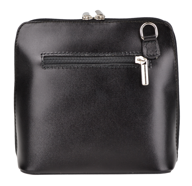 Elegantní, ale zároveň velmi praktická kabelka malých rozměrů vyrobena z pravé černé kůže. Díky tenkému pásku je nositelná přes rameno. Zip, kterým se uzavírá, vede po hraně kabelky až po spodní okraj na obou stranách, a proto je její vnitřek dobře dostupný. Na vnější zadní straně najdete na kabelce malou kapsu na zip a uvnitř dělí celý prostor na dvě části příčka, která současně slouží jako kapsa na zip. Hloubka jejího dna je 8 cm. Délka přídavného popruhu je cca 120 cm.