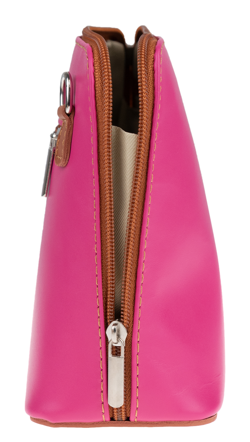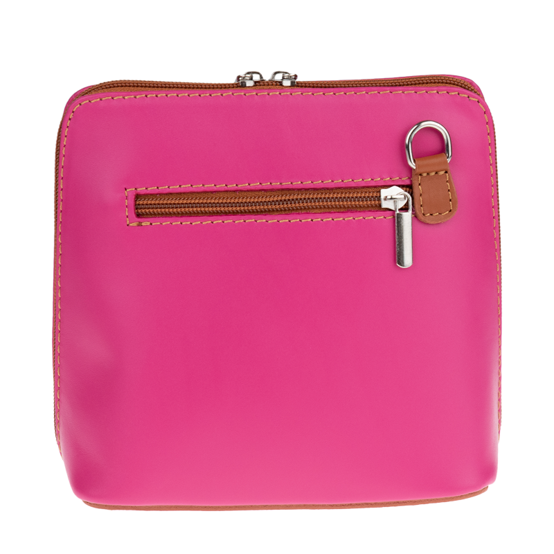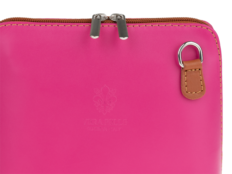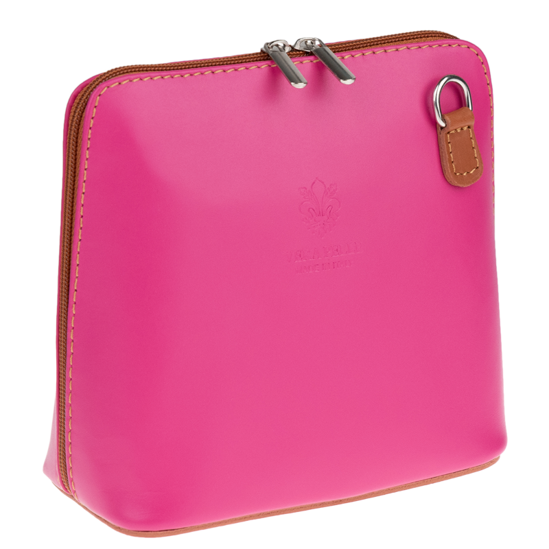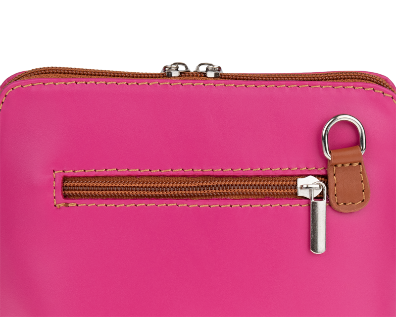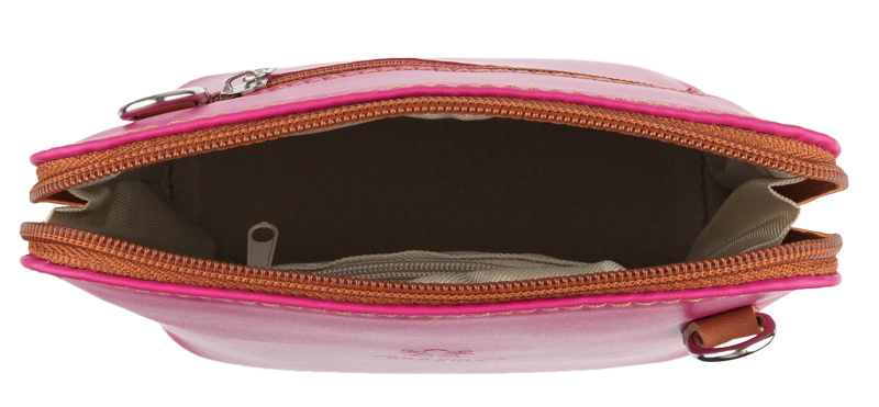 Elegantní, ale zároveň velmi praktická růžová kabelka malých rozměrů vyrobena z pravé kůže. Díky tenkému pásku je nositelná přes rameno. Zip, kterým se uzavírá, vede po hraně kabelky až po spodní okraj na obou stranách, a proto je její vnitřek dobře dostupný. Na vnější zadní straně najdete na kabelce malou kapsu na zip a uvnitř dělí celý prostor na dvě části příčka, která současně slouží jako kapsa na zip. Hloubka jejího dna je 8 cm. Délka přídavného popruhu je cca 120 cm.