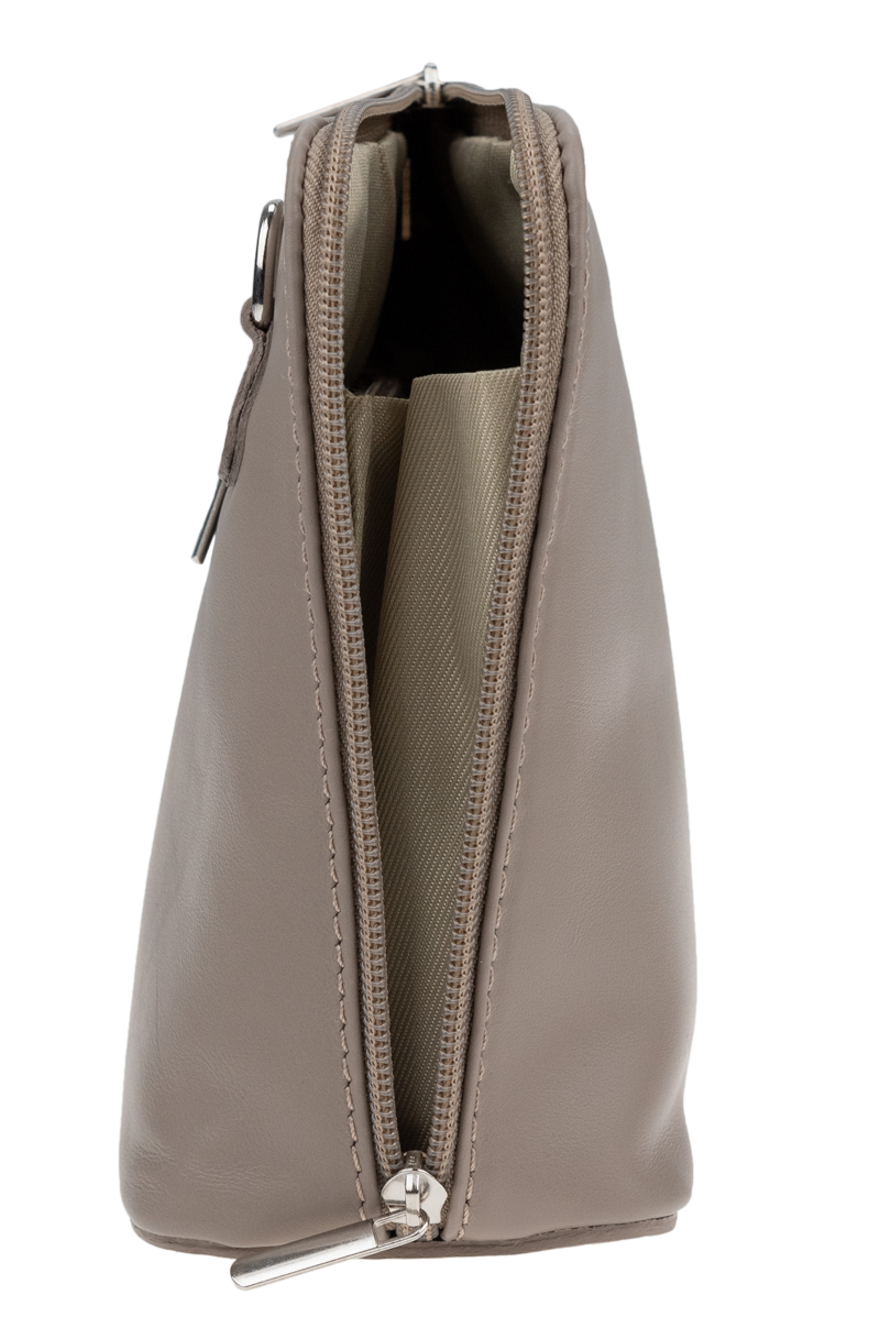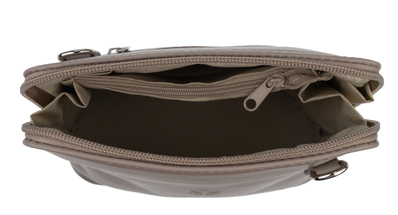 Elegantní, ale zároveň velmi praktická hnědá kabelka malých rozměrů vyrobena z pravé kůže. Díky tenkému pásku je nositelná přes rameno. Zip, kterým se uzavírá, vede po hraně kabelky až po spodní okraj na obou stranách, a proto je její vnitřek dobře dostupný. Na vnější zadní straně najdete na kabelce malou kapsu na zip a uvnitř dělí celý prostor na dvě části příčka, která současně slouží jako kapsa na zip. Hloubka jejího dna je 8 cm. Délka přídavného popruhu je cca 120 cm.