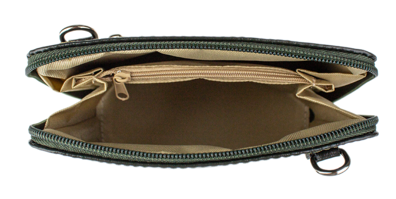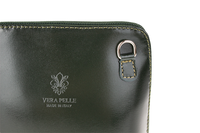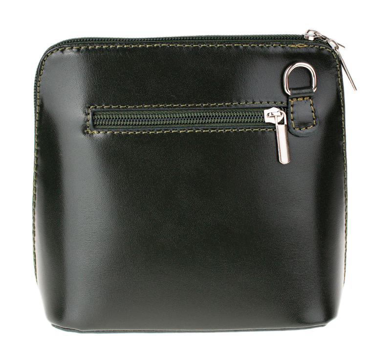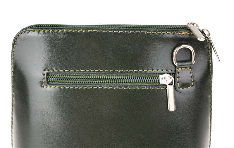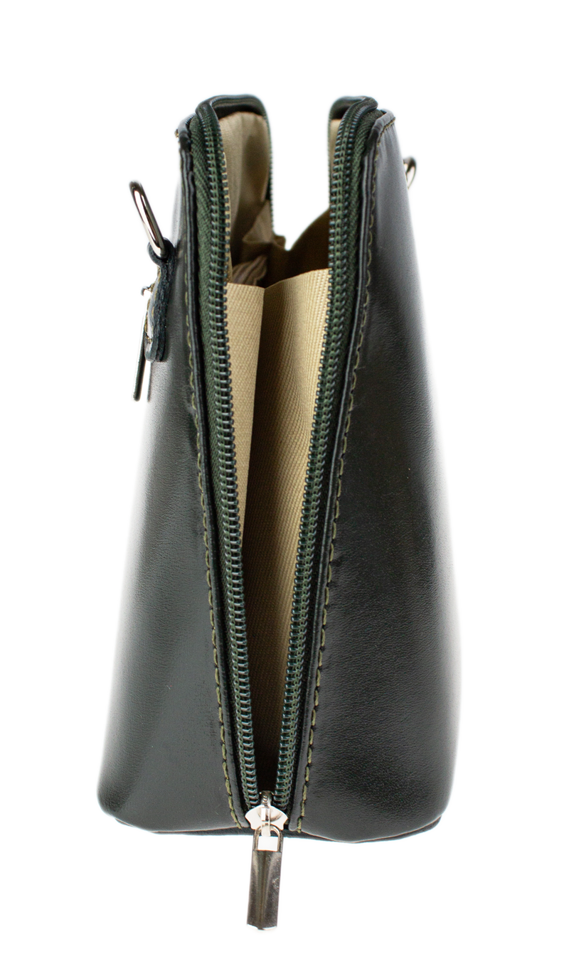 Elegantní, ale zároveň velmi praktická zelená kabelka malých rozměrů vyrobena z pravé kůže. Díky tenkému pásku je nositelná přes rameno. Zip, kterým se uzavírá, vede po hraně kabelky až po spodní okraj na obou stranách, a proto je její vnitřek dobře dostupný. Na vnější zadní straně najdete na kabelce malou kapsu na zip a uvnitř dělí celý prostor na dvě části příčka, která současně slouží jako kapsa na zip. Hloubka jejího dna je 8 cm. Délka přídavného popruhu je cca 120 cm.