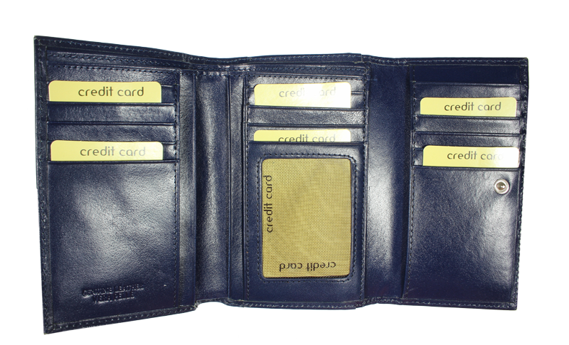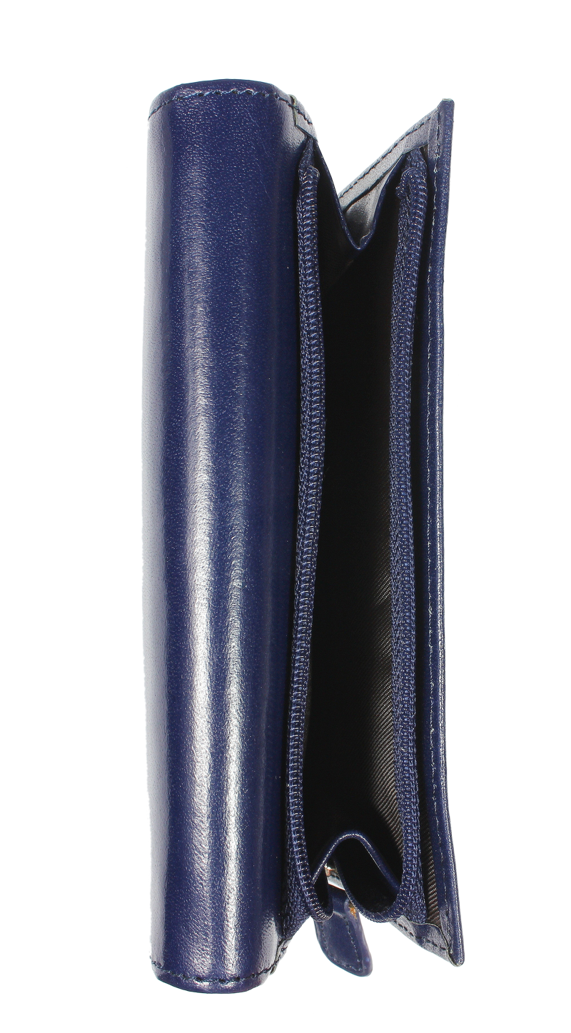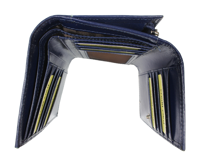 Elegantní dámská peněženka klasického designu v modré barvě. Tato kožená peněženka mírně obdélníkového tvaru se zavírá na patentek (cvoček). Má spoustu praktických přihrádek: zavírací kapsu na mince, jež zavírá pomocí dalšího patentku; 2 kapsy formátu bankovek, z nich 1 se zavírá na zip; a celkem 14 míst na platební a jiné karty. Navíc disponuje ještě 1 vnější kapsou na zip vhodnou na mince – při drobné útratě, tak není nutné otvírat celou peněženku.