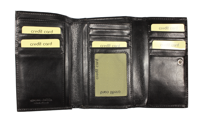 Elegantní dámská peněženka klasického designu v černé barvě. Tato kožená peněženka mírně obdélníkového tvaru se zavírá na patentek (cvoček). Má spoustu praktických přihrádek: zavírací kapsu na mince, jež zavírá pomocí dalšího patentku; 2 kapsy formátu bankovek, z nich 1 se zavírá na zip; a celkem 14 míst na platební a jiné karty. Navíc disponuje ještě 1 vnější kapsou na zip vhodnou na mince – při drobné útratě, tak není nutné otvírat celou peněženku.